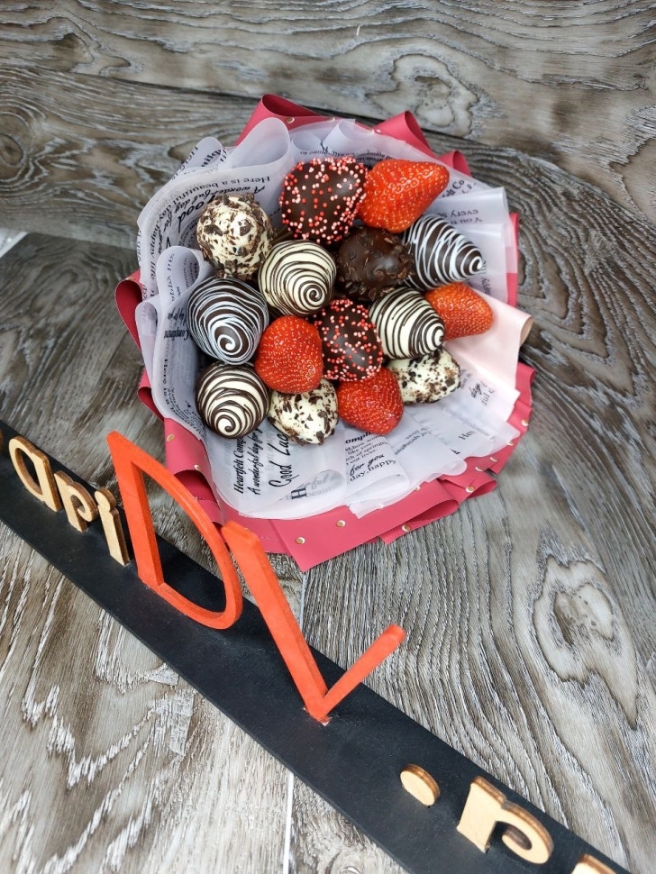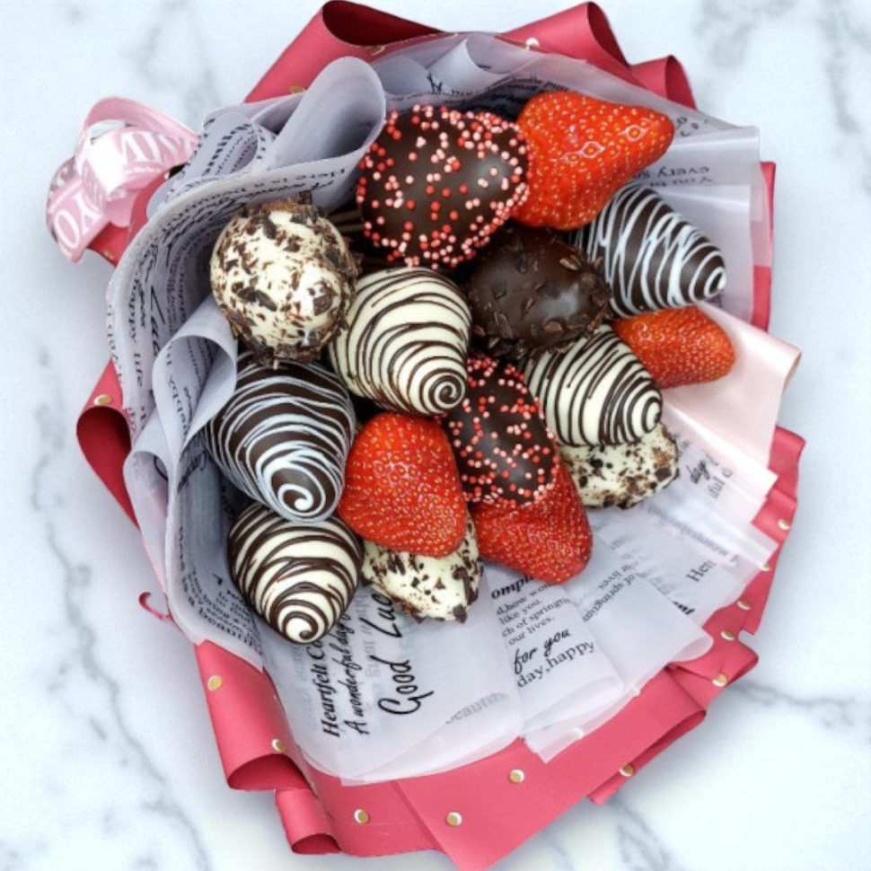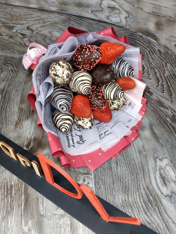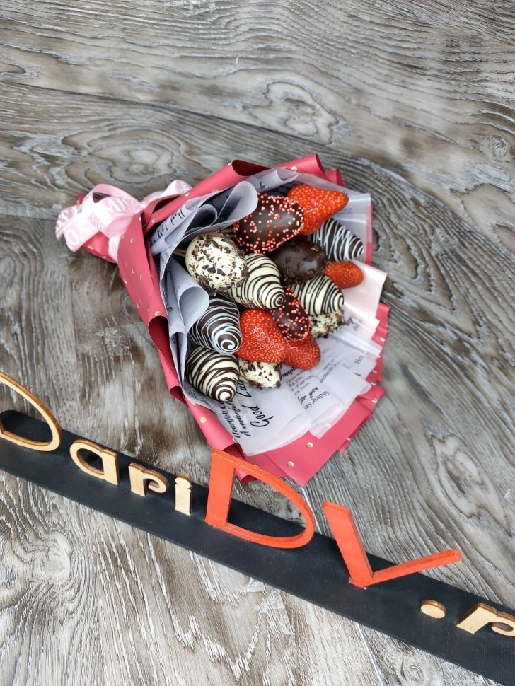 Состав букетаБукет состоит из 11 ягод клубники, покрытых вкуснейшим бельгийским темным и белым шоколадом. Композиция также включает свежую клубнику - 4 шт. Подарок украшает шоколадная стружка и сахарная посыпка, а также узоры ручной работы.