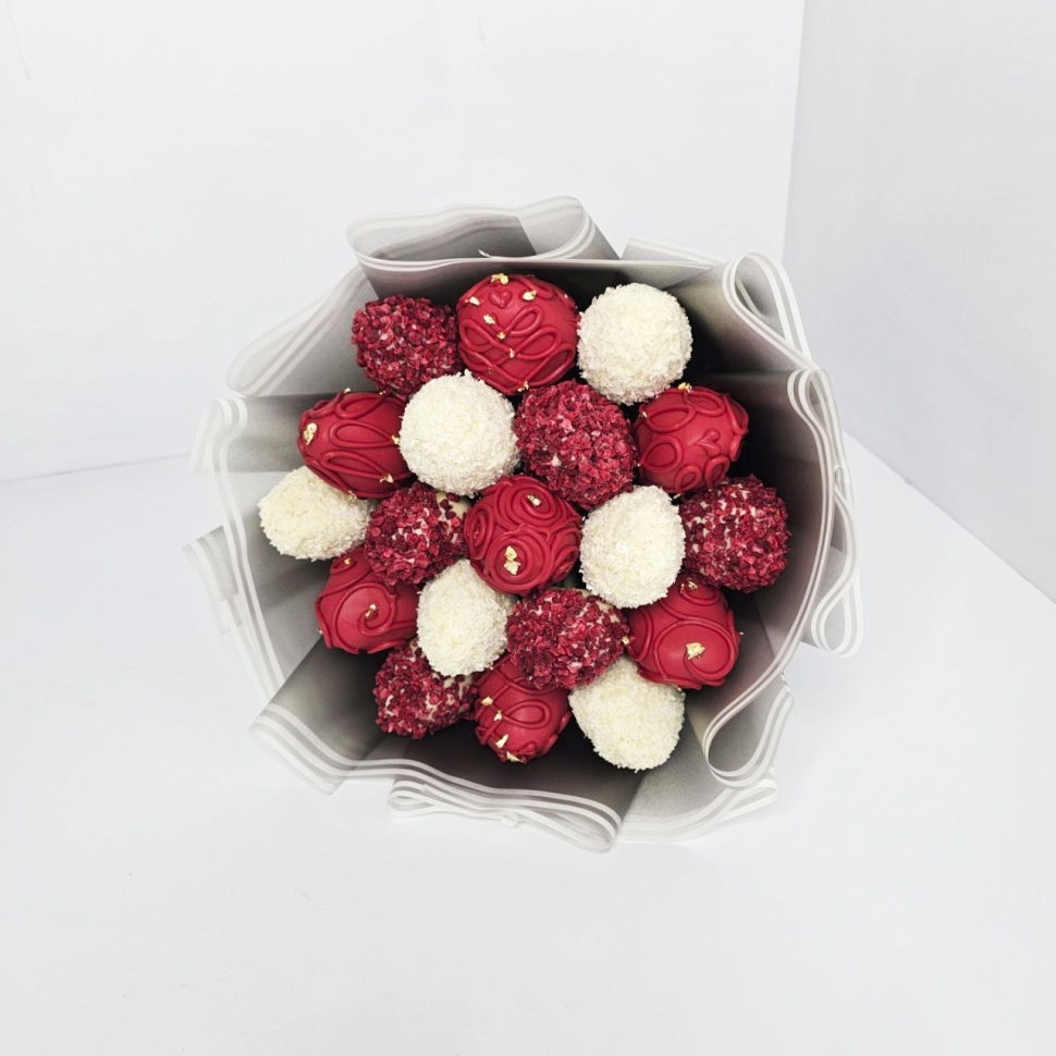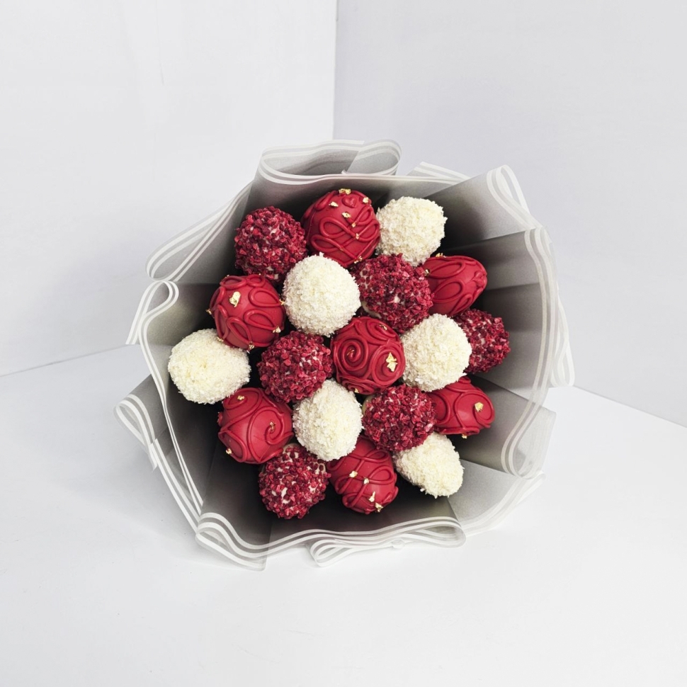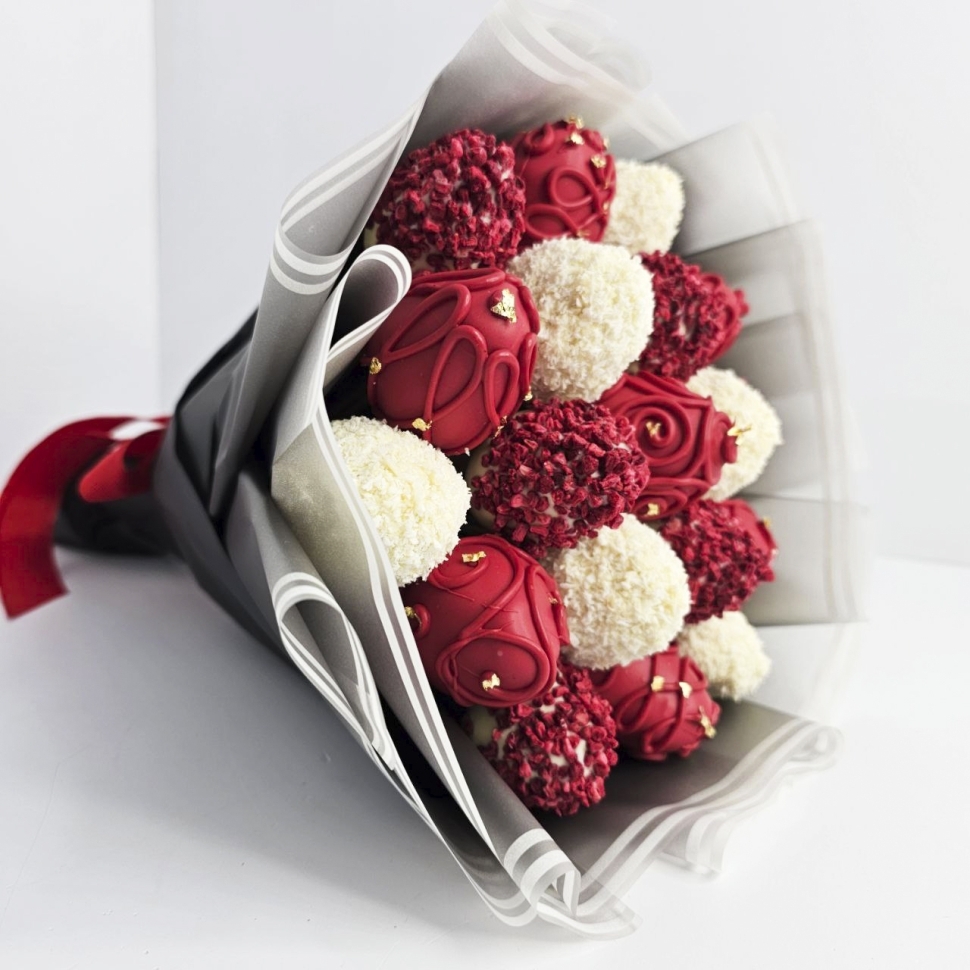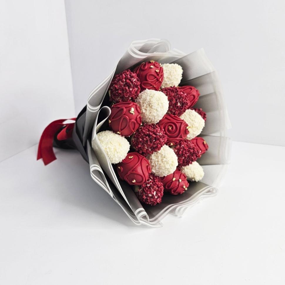Особенности букетаЭтот букет необычен не только своим внешним видом. Белый шоколад, в котором обтянуты ягоды, придает клубнике особенный, нежный вкус. К тому же, в состав букета входят сублимированная малина и кокосовая стружка, которые делают каждый кусочек еще более насыщенным и ароматным. А узоры ручной работы и дизайнерская упаковка делают этот букет не только вкусным, но и красивым подарком.