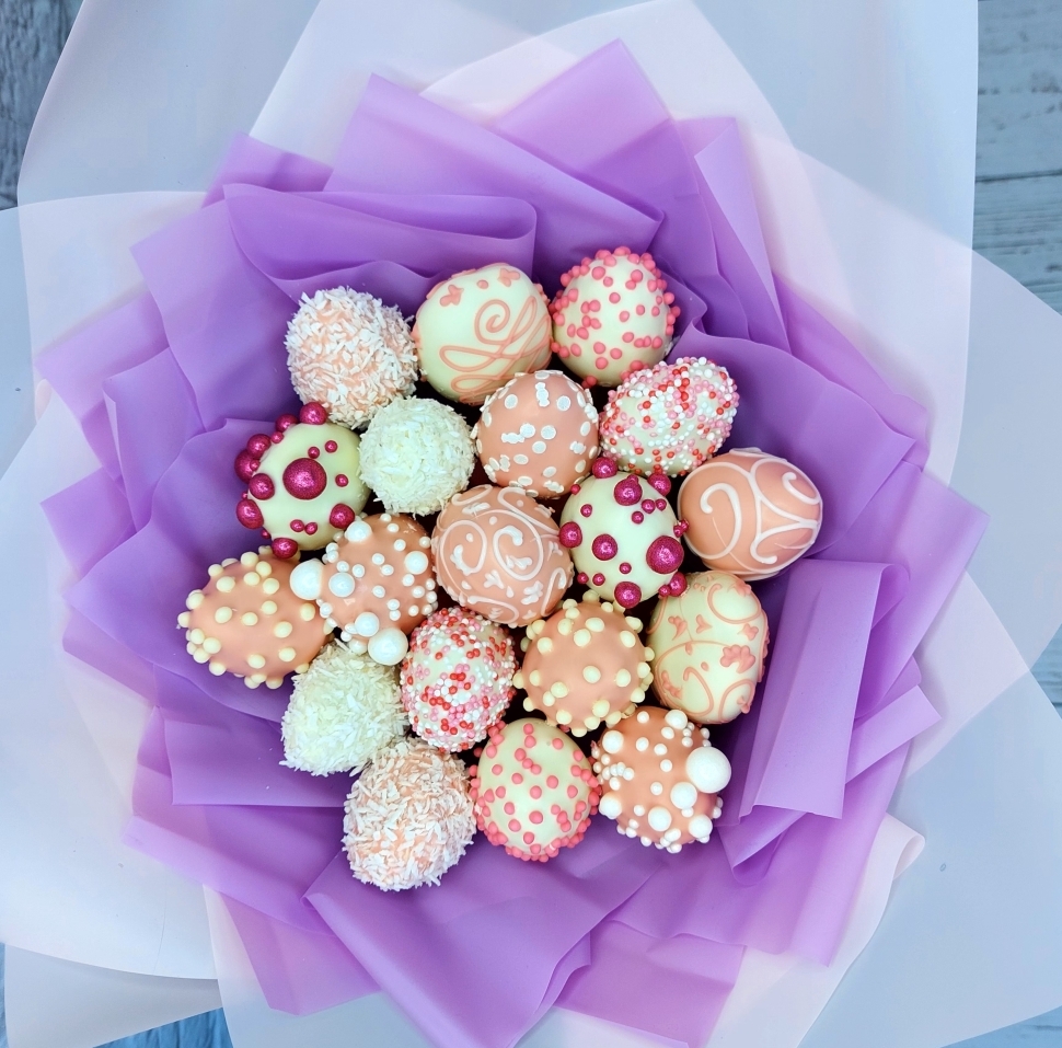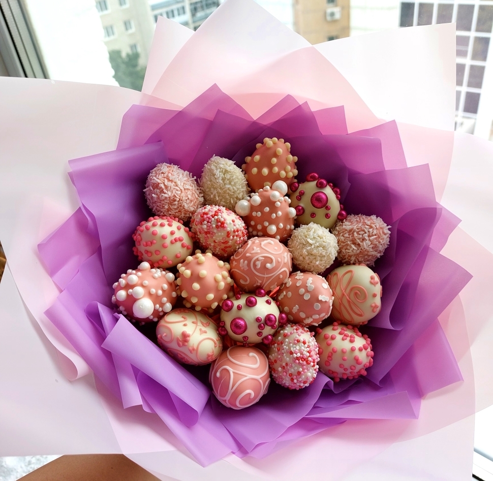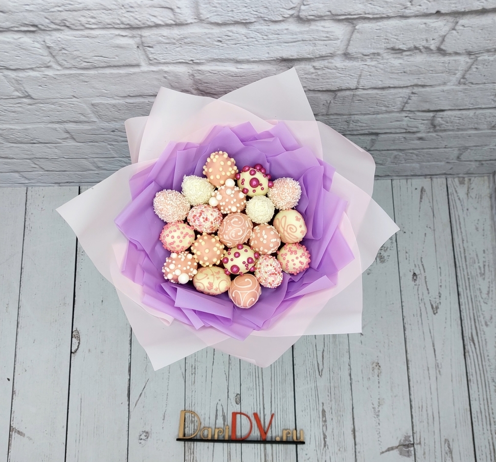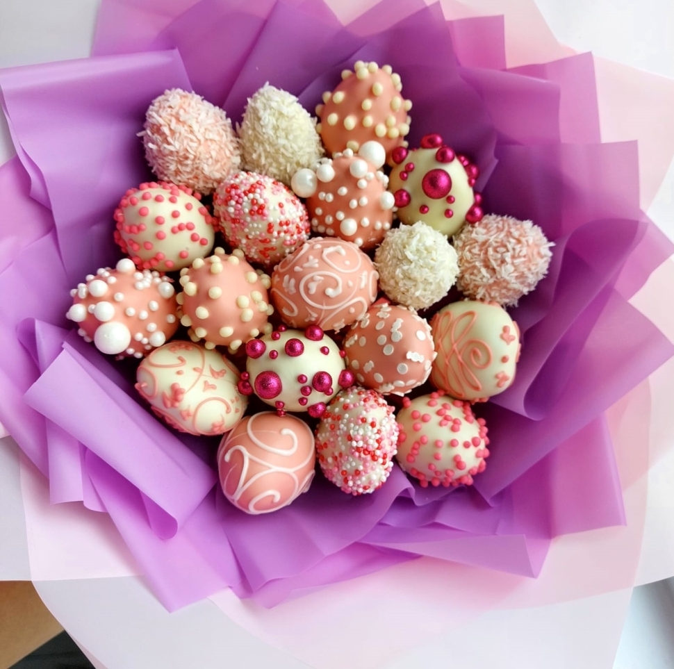 Внешний вид букетаКаждая ягода облачена в шоколадный наряд. Розовый и белый оттенки шоколада, кокосовая стружка и сладкая кондитерская посыпка создают неповторимый дизайн. Узоры ручной работы добавляют каждому "цветку" уникальности.