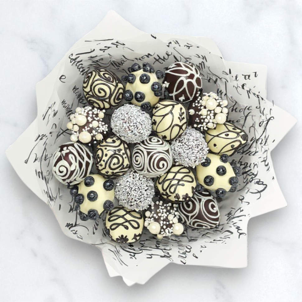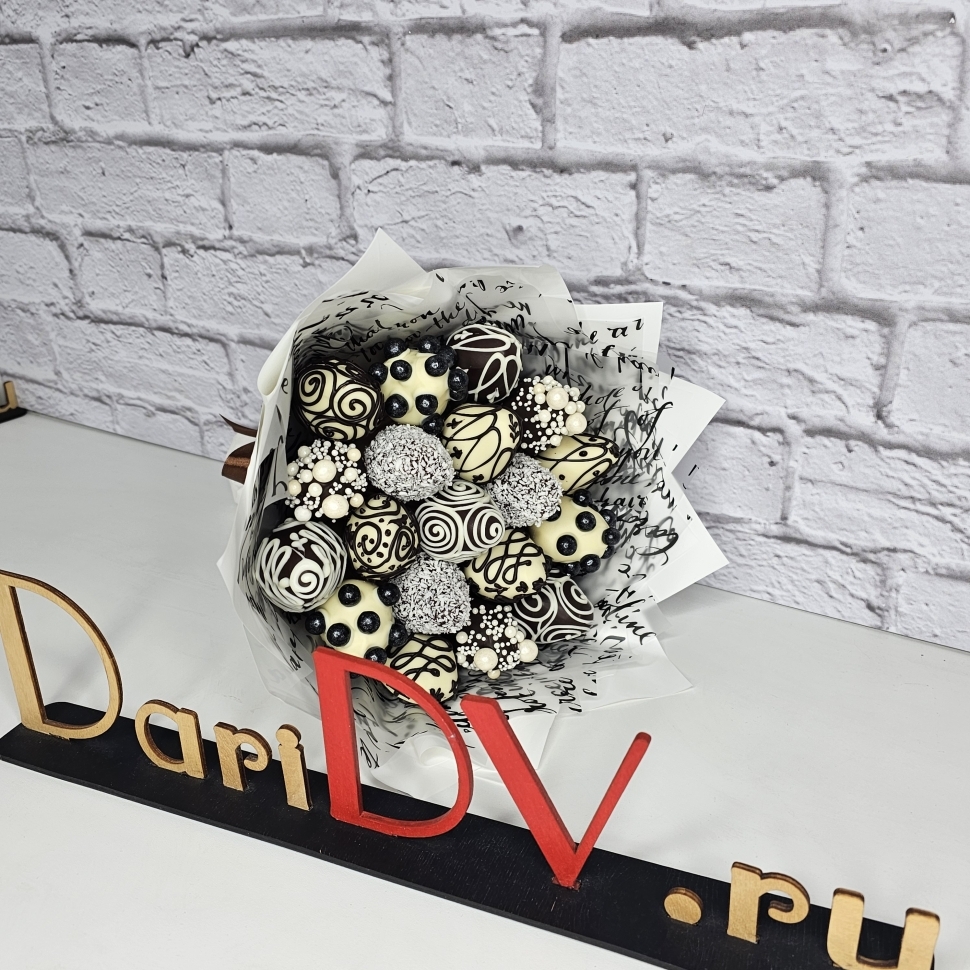 Состав букетаВ основе букета - свежайшая клубника, покрытая двумя видами бельгийского шоколада: белым и темным. Ягоды украшены сладкой кондитерской посыпкой и кокосовой стружкой, а также узорами ручной работы. Такой букет станет прекрасной альтернативой обычным цветам.