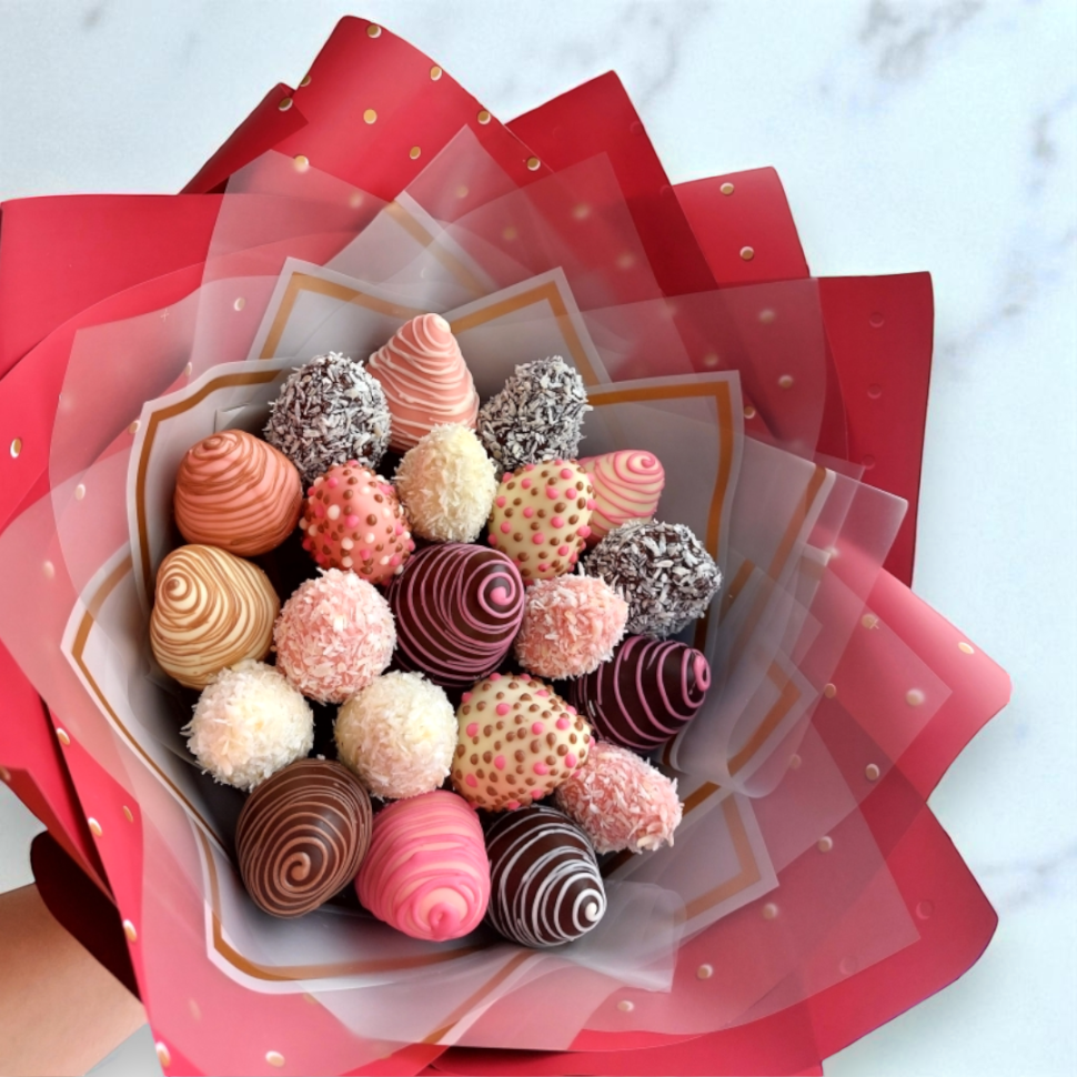 Композиция букетаВ основе букета – 21 спелая ягода клубники, каждая из которых покрыта бельгийским шоколадом. Вы можете выбрать между белым, молочным или темным шоколадом – каждый из них подчеркнет уникальный вкус и аромат ягоды. Клубника в шоколаде – это великолепное сочетание сладости шоколада и легкой кислинки ягод.