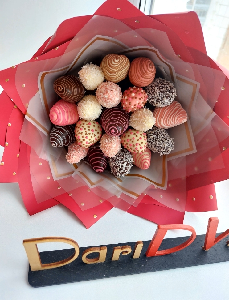 Оформление букетаОформление букета выполнено в элегантной черной, розовой, белой или шоколадной цветовой гамме. Букет украшен кокосовой стружкой и узорами ручной работы, что придает ему особую изысканность. Бант из атласной ленты добавляет завершающий акцент.
