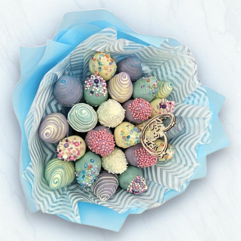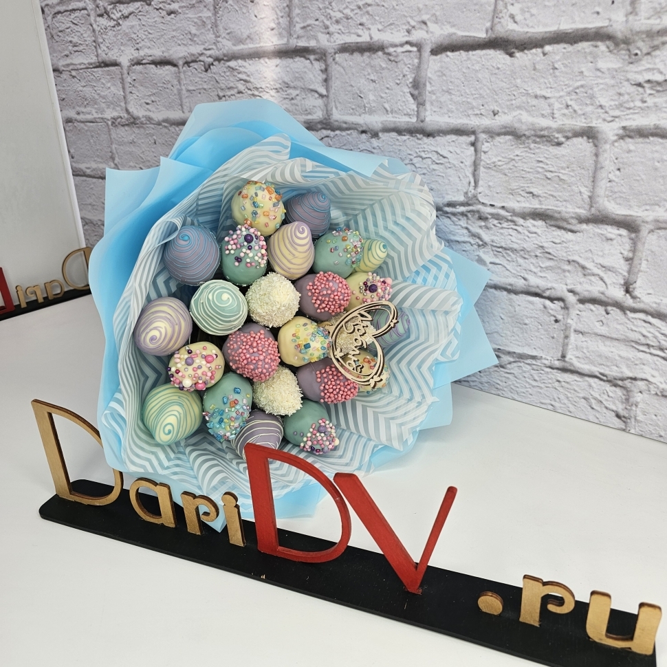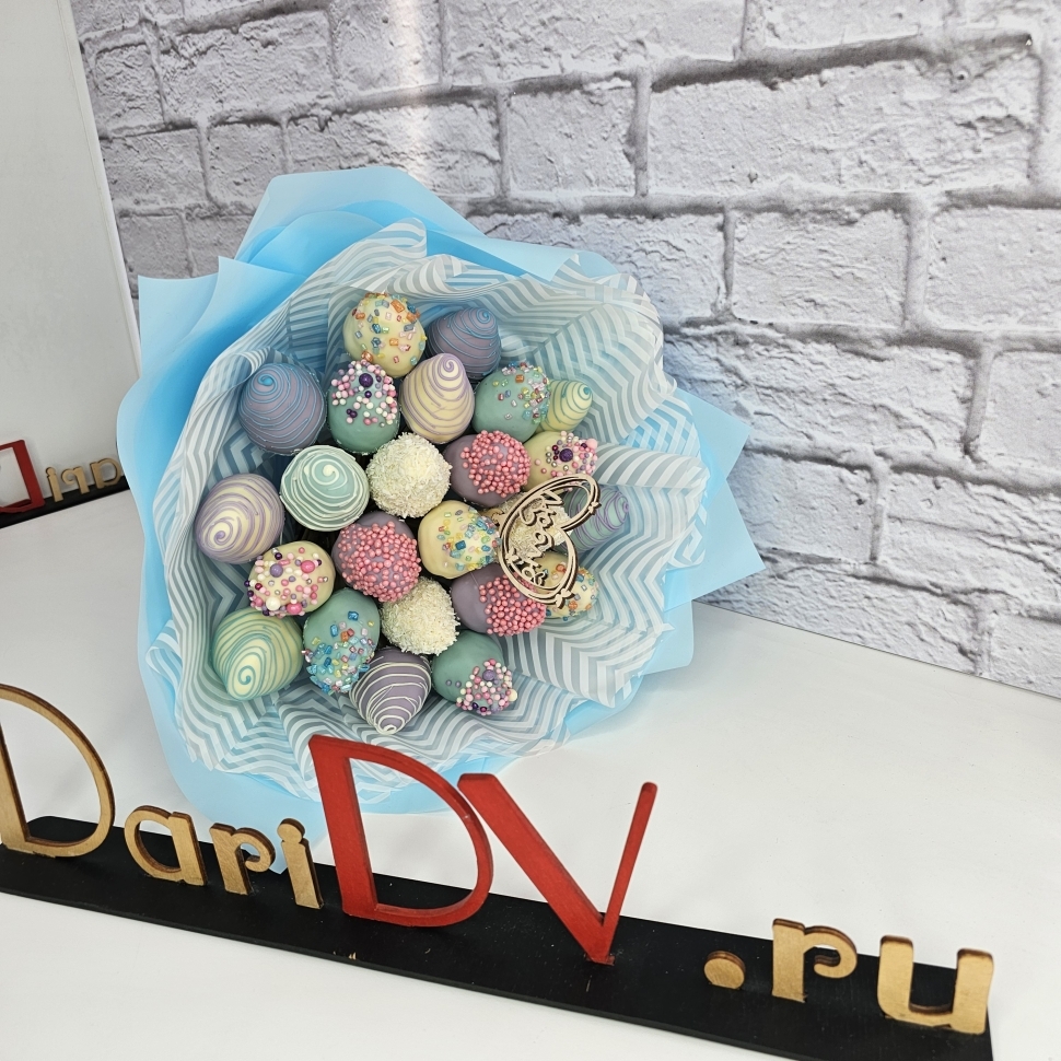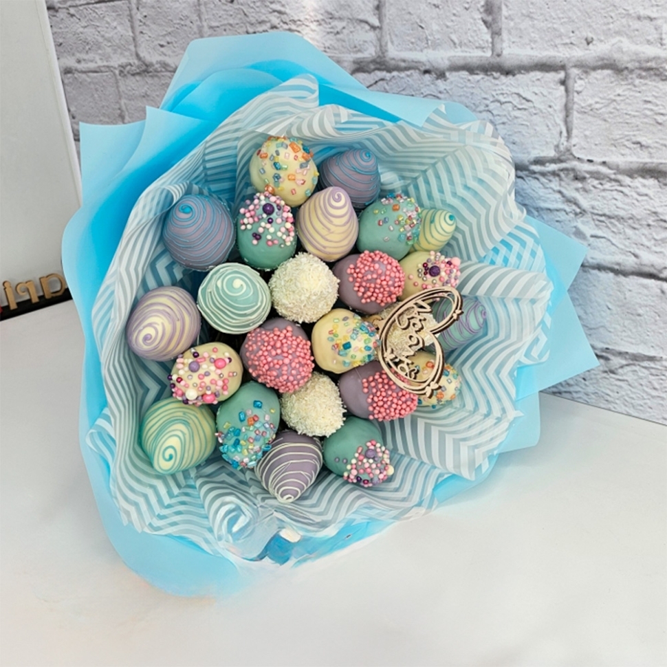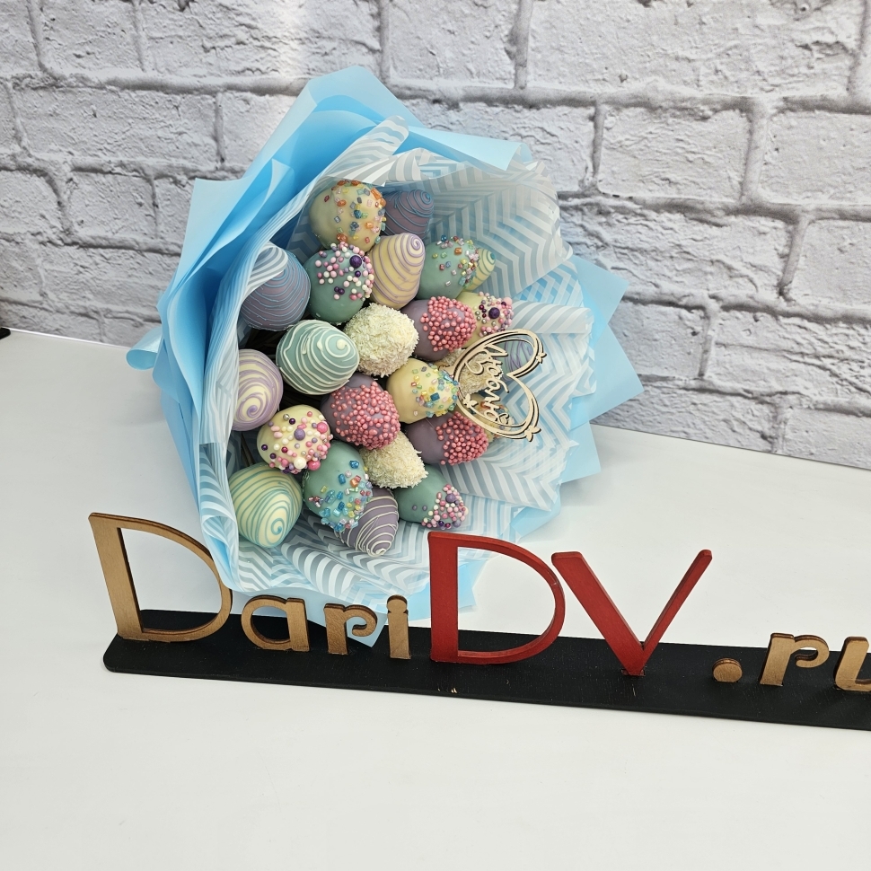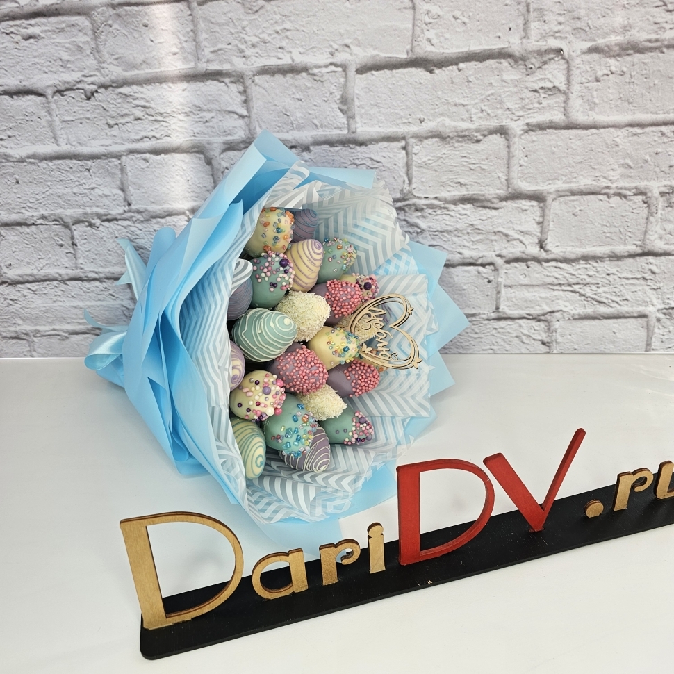 Тонкости дизайна и составаКаждая ягода в этом букете облита восхитительным бельгийским белым шоколадом и украшена роскошной кондитерской посыпкой. Это настоящая сладкая симфония вкусов! Добавьте к этому узоры ручной работы и кокосовую стружку — и ваш подарок готов удивить самого искушенного сладкоежку.
