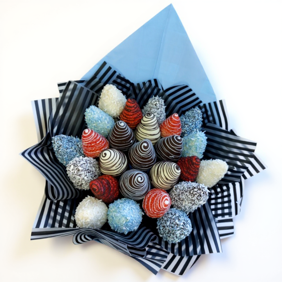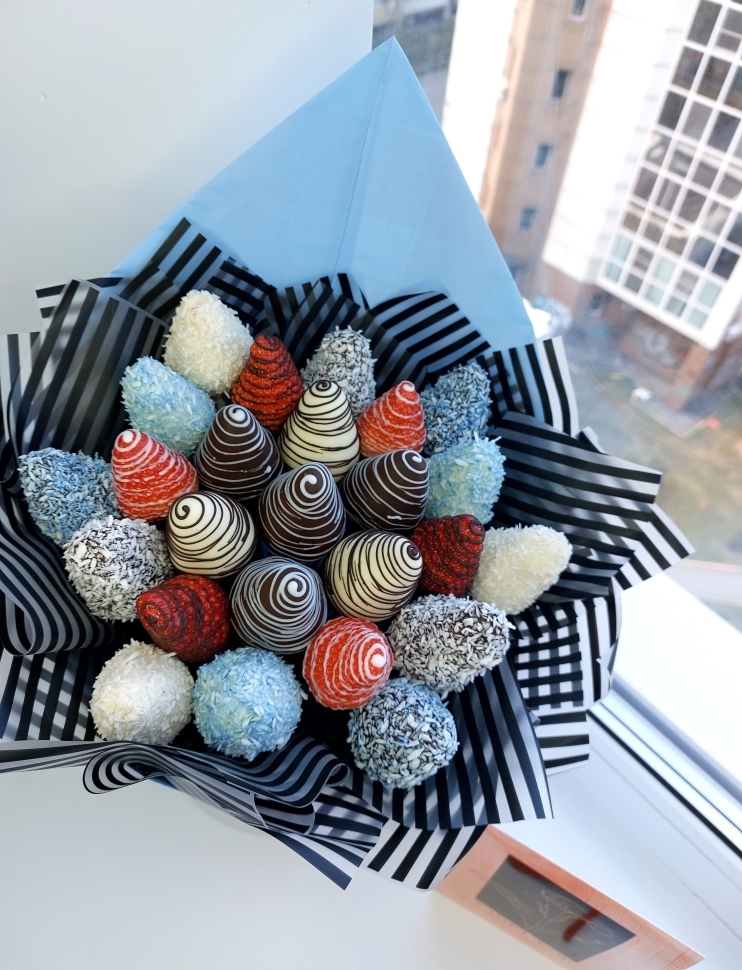 Состав букетаБукет состоит из 25 ягод клубники, покрытых бельгийским шоколадом. Ягоды украшены узорами ручной работы. Дополняет композицию элегантный бант из атласной ленты. Все это упаковано в дизайнерскую коробку, декорированную кокосовой стружкой.