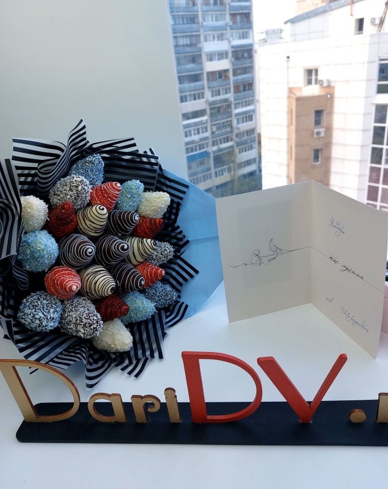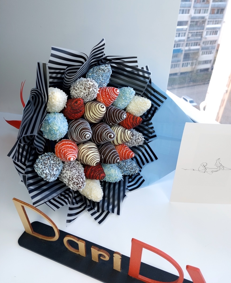Представляем вашему вниманию прекрасный подарок - Букет из 25 клубник, облаченных в бельгийский шоколад от бренда DariDV. Этот изысканный продукт станет идеальным подарком для любимых и близких вам людей.