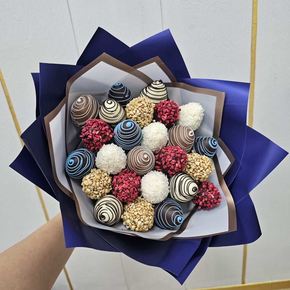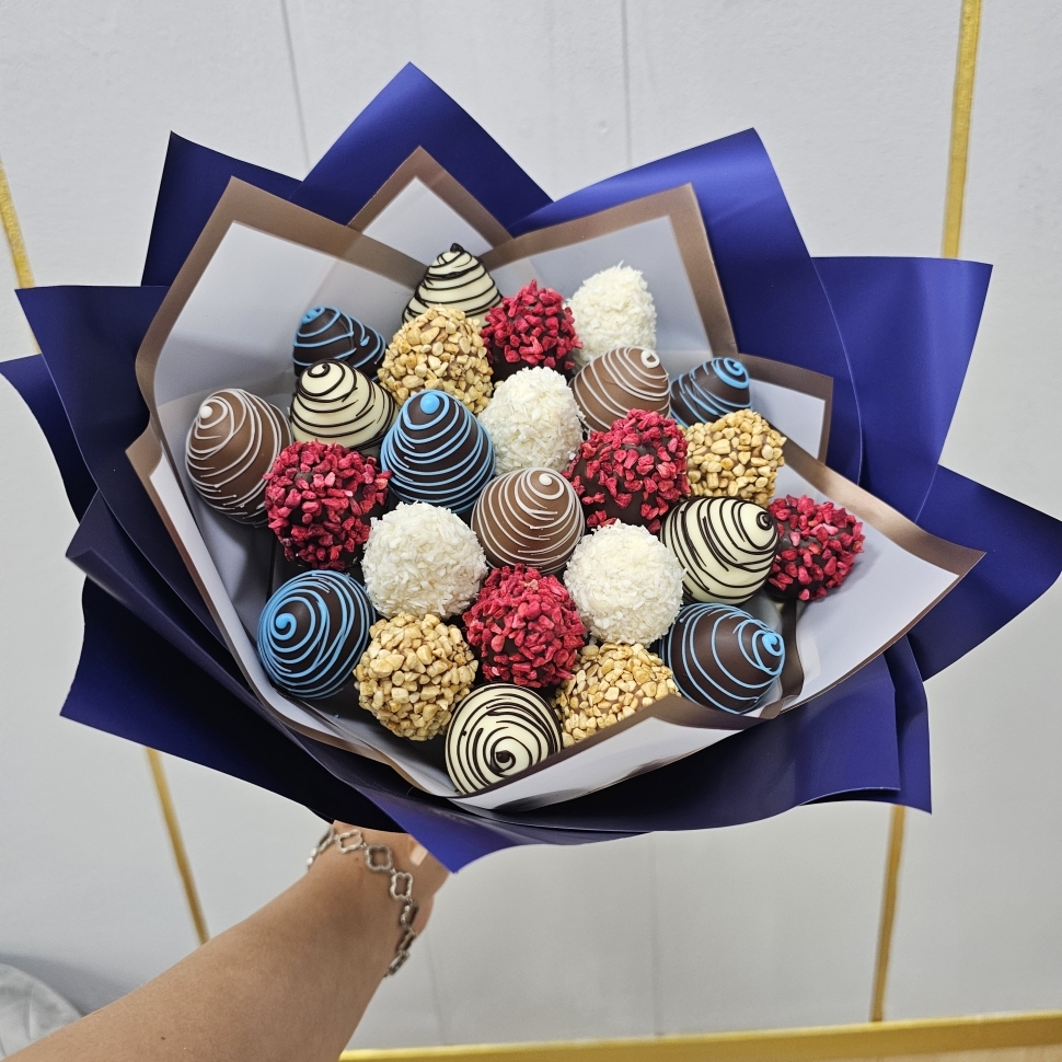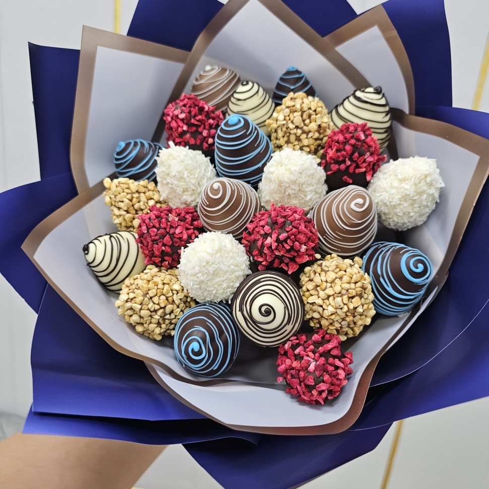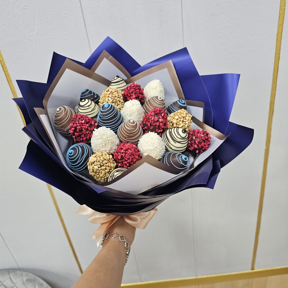Подарок для всех и каждогоНезависимо от того, кому предназначается этот букет - Парню, Сыну, Дочке, Тёще, Подруге, Сестре, Тёте, Бабушке, Мальчику, Маме, Папе, Брату, Дедушке, Любимому, Любимой, Начальнику, Другу, Девочке, Коллеге, Учителю, Преподавателю, Мужу, Жене, Ребенку, Невесте - он будет радовать и удивлять. Букет 25 клубник в шоколаде - это универсальный подарок, который подходит для любого случая.