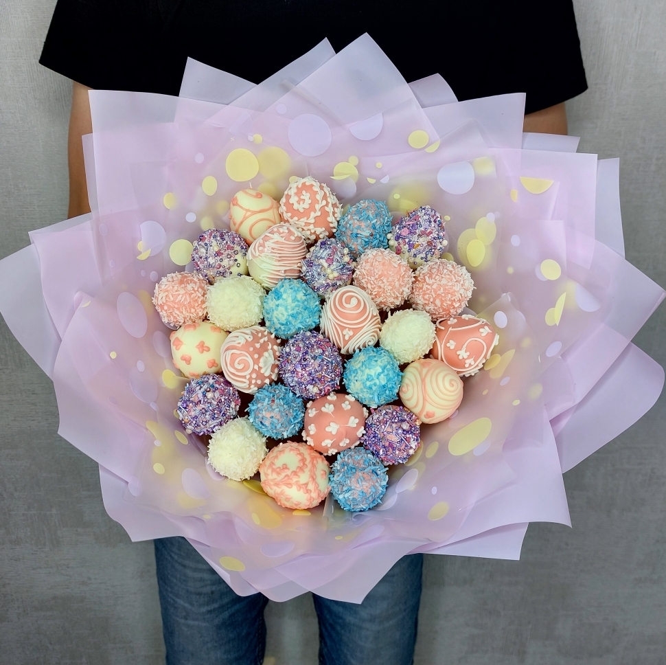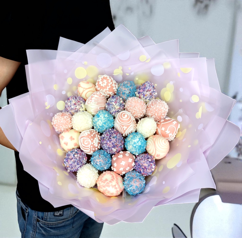 Эстетическое удовольствие и вкусовые впечатления27 клубник, облаченных в бельгийский белый шоколад, украшены кокосовой стружкой и сладкой кондитерской посыпкой, а также узорами ручной работы. Все это создает не только потрясающий вкус, но и превосходный визуальный образ. Букет из клубники в шоколаде — это не просто десерт, это произведение искусства. Каждый букет упакован в дизайнерскую упаковку и украшен бантом из атласной ленты.