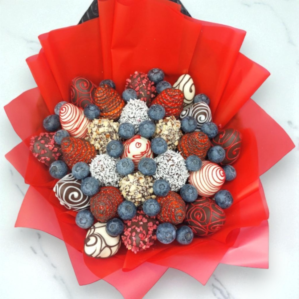 Состав букетаОснова букета – это 27 ягод клубники, покрытых бельгийским белым и темным шоколадом. Дополнительно букет декорирован свежей черникой, сублимированной малиной, кокосовой стружкой и посыпкой из дробленых орехов. Изюминкой станут узоры ручной работы, которые придают букету индивидуальности.