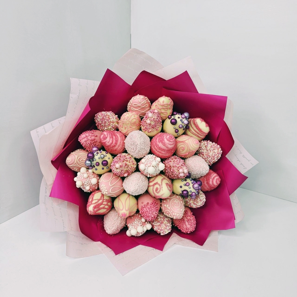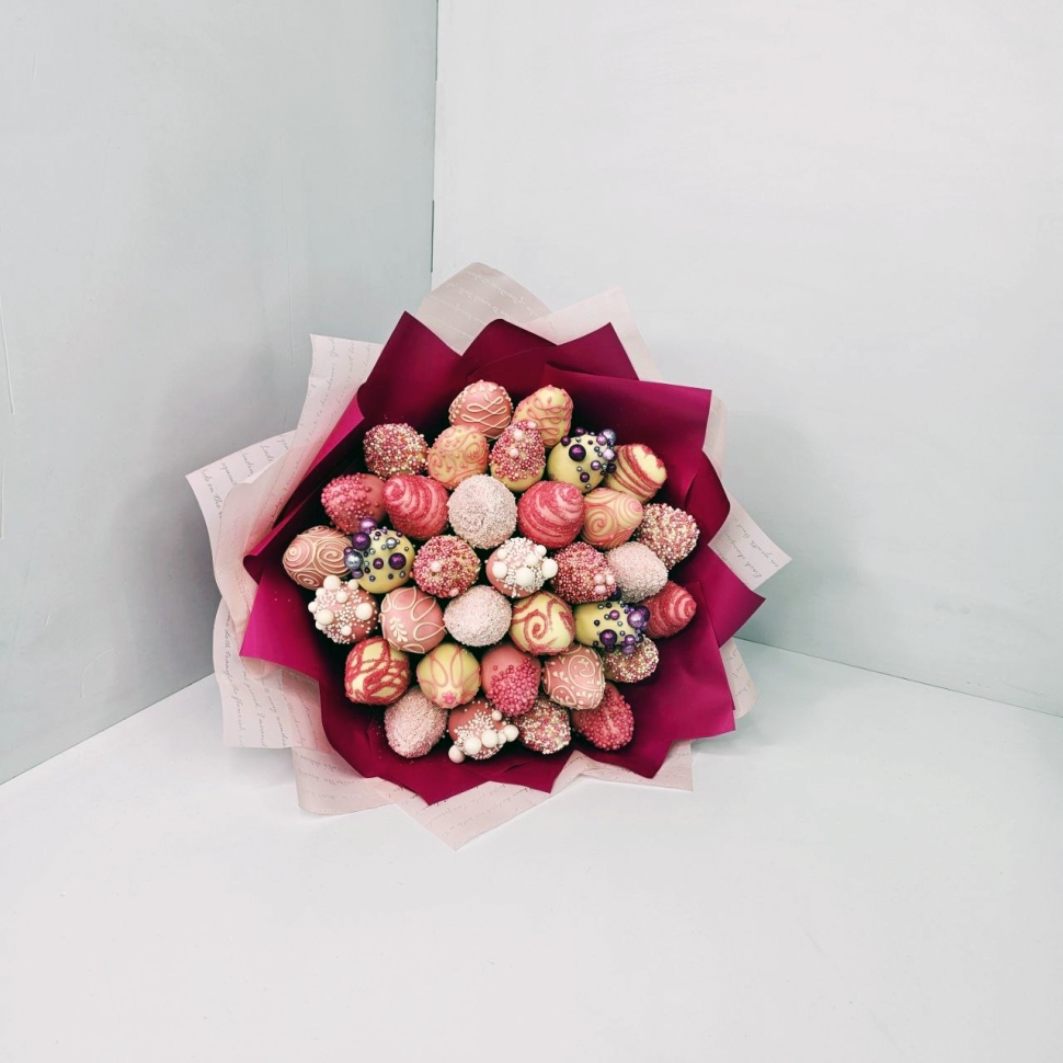 Состав букетаБукет состоит из 33 ягод спелой ароматной клубники, покрытых бельгийским белым шоколадом. Ягоды декорированы сладкой посыпкой и кокосовой стружкой. Каждая ягода внимательно упакована в дизайнерскую упаковку и завязана атласной лентой. Бельгийский белый шоколад придает ягодам особый вкус и аромат, делая их еще более привлекательными и вкусными.