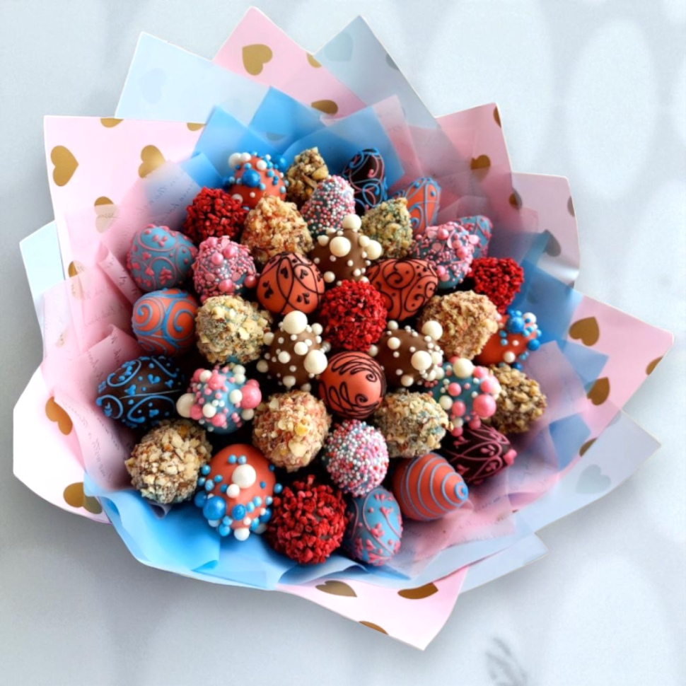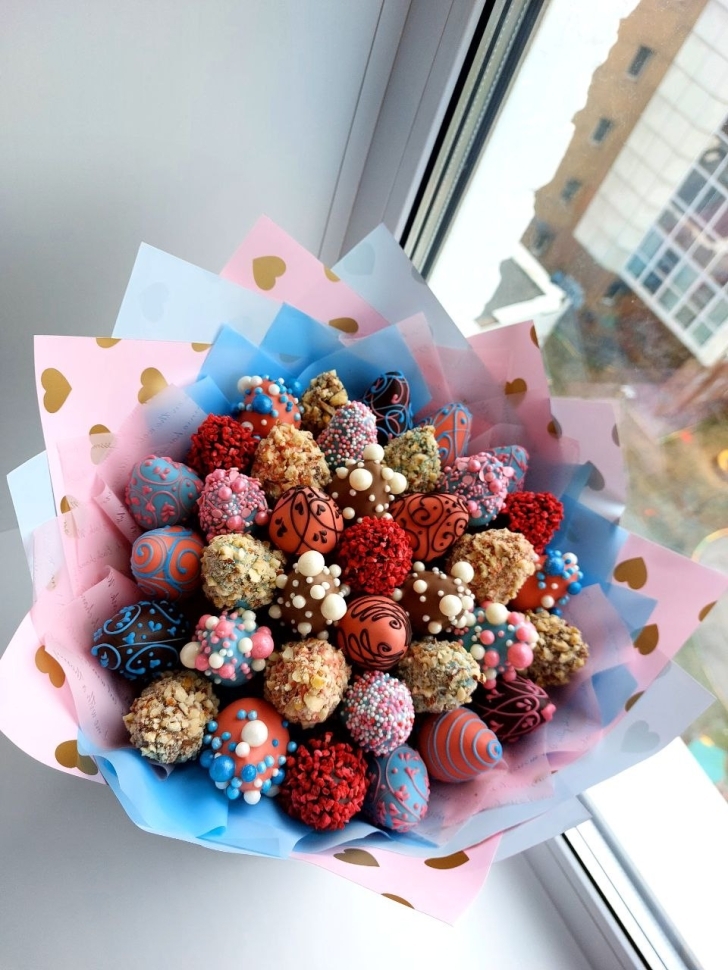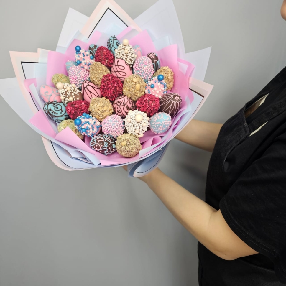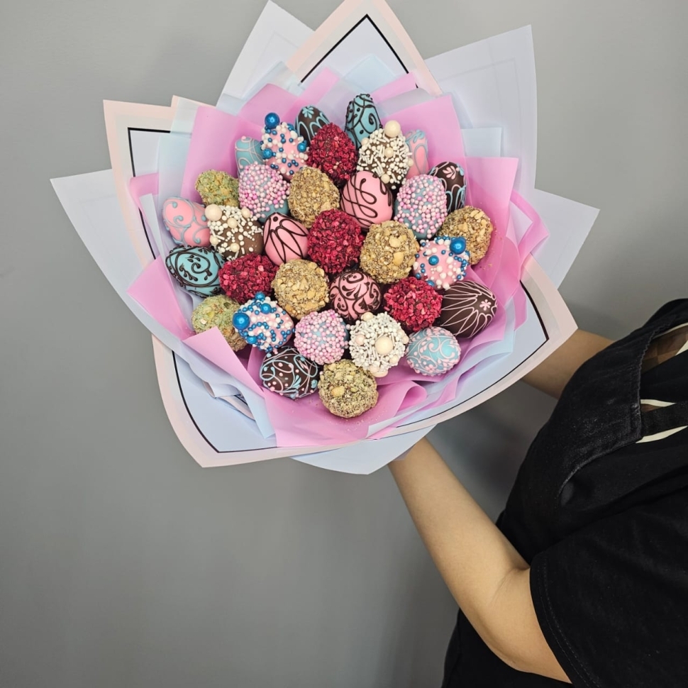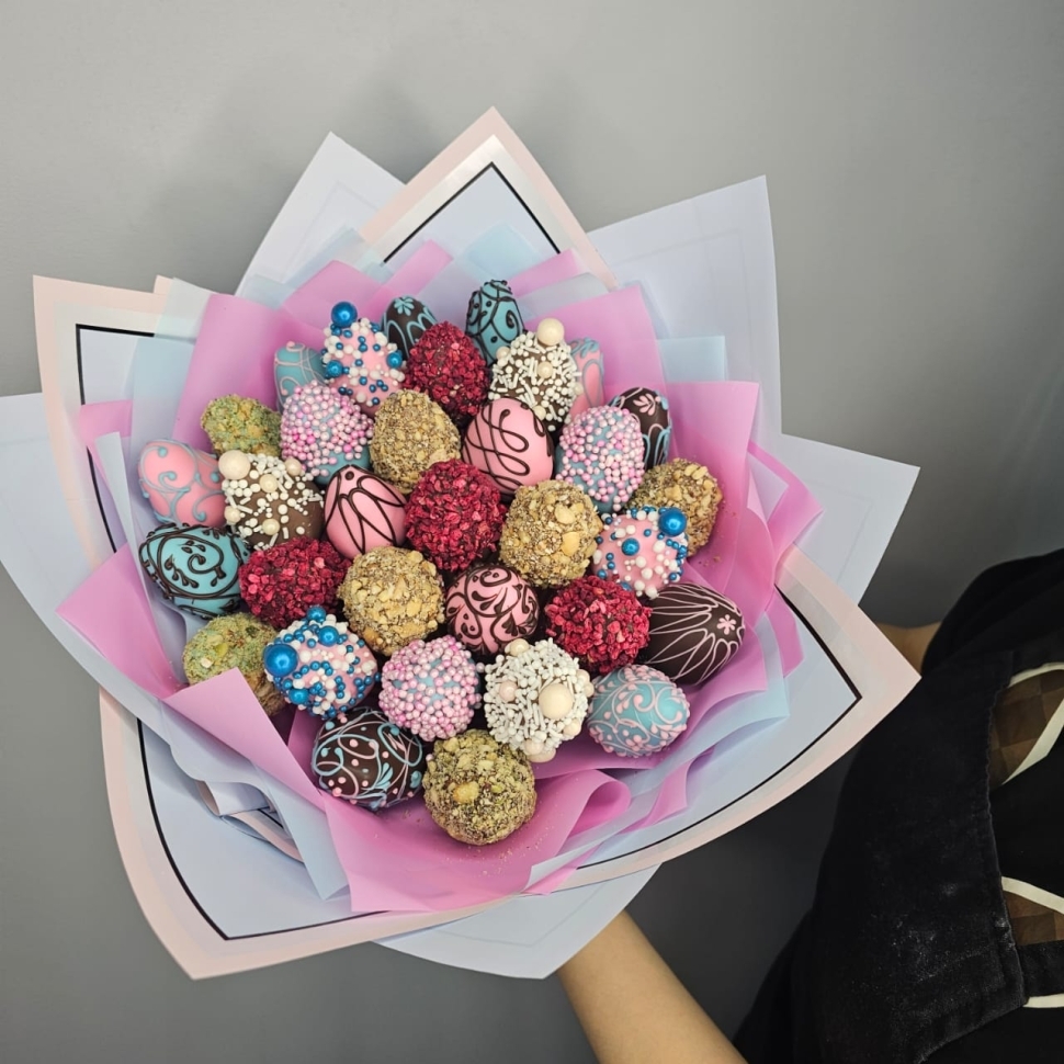 Каждый букет собирается вручную из 37 свежих, сочных ягод клубники, об dipped в бельгийском шоколаде. Все ягоды тщательно отбираются и покрываются одним из трех видов бельгийского шоколада на выбор: белый, молочный или темный. Дополнительная декорация в виде сублимированной малины, сладкой кондитерской посыпки, дробленых орехов добавляет букету изысканности и яркости.