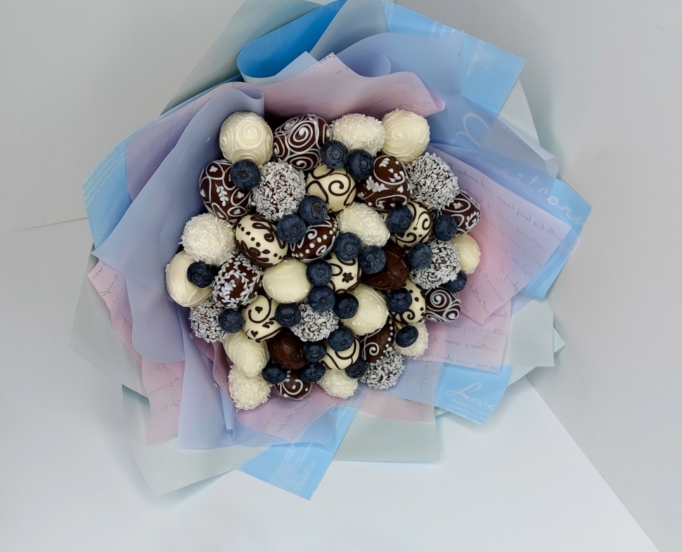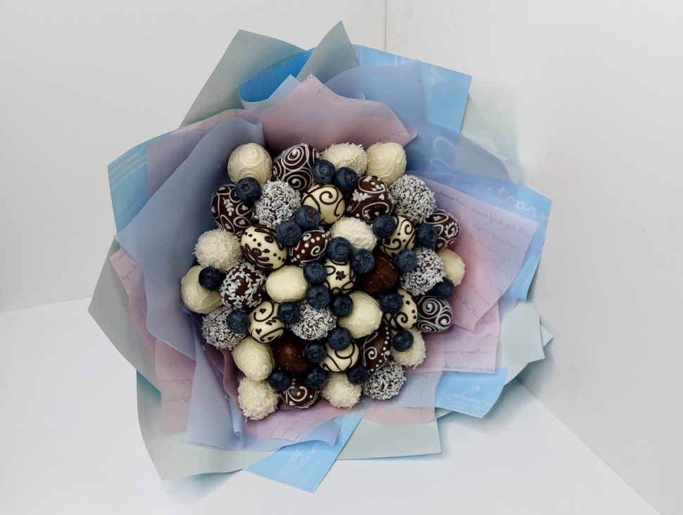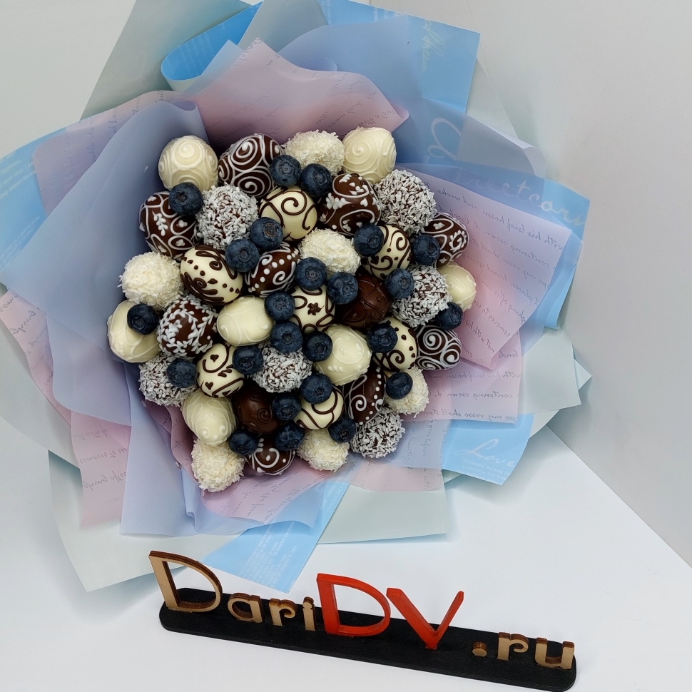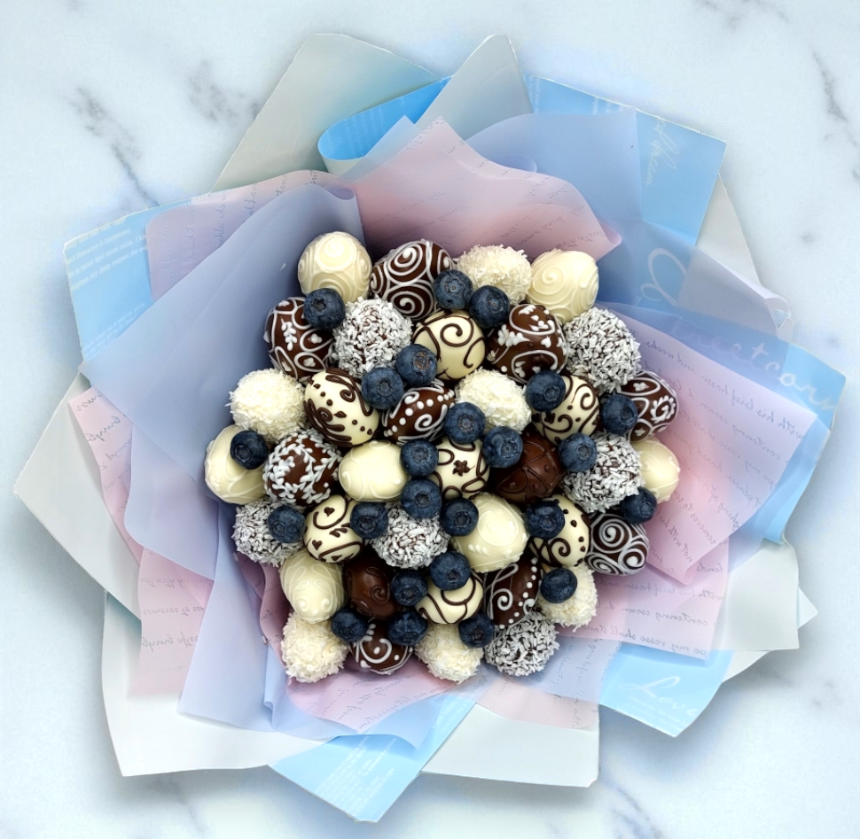 Великолепный вкусКлубника, покрытая бельгийским шоколадом, обсыпана кокосовой стружкой, а свежая черника добавляет особый акцент. Вкус этого букета будет радовать как детей, так и взрослых. Ведь что может быть лучше сочетания ягод и шоколада?