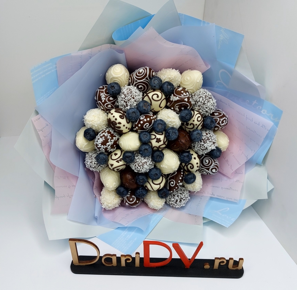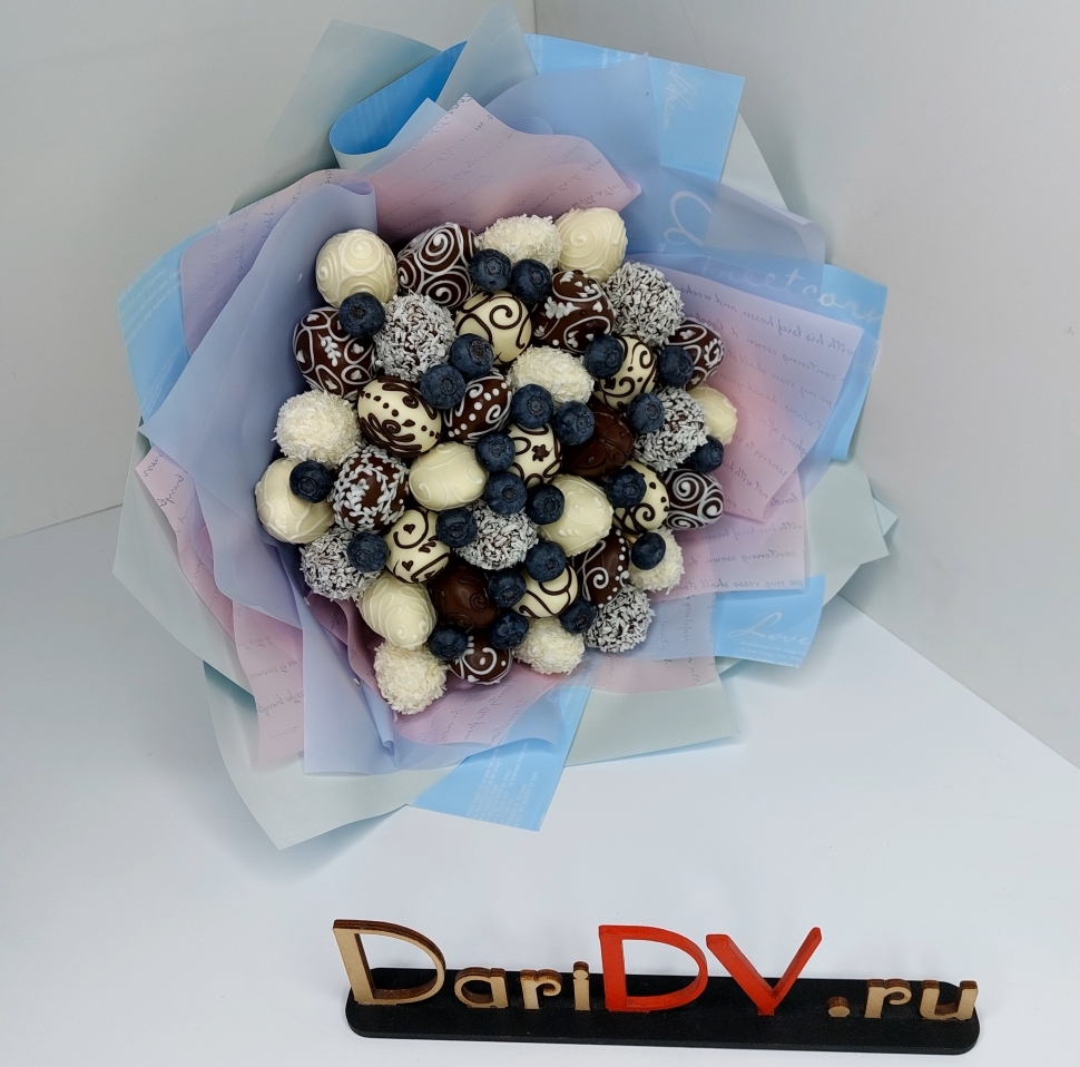 Настоящее произведение искусства - Букет из 37 клубник в шоколаде от бренда DariDV. Каждая ягода тщательно обволакивается вкуснейшим бельгийским шоколадом и украшается яркими узорами ручной работы. Букет придет в стильной дизайнерской упаковке, украшенной атласным бантом.