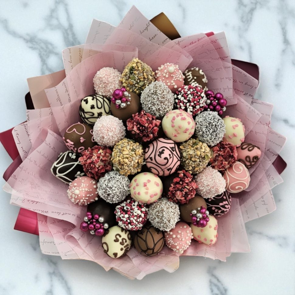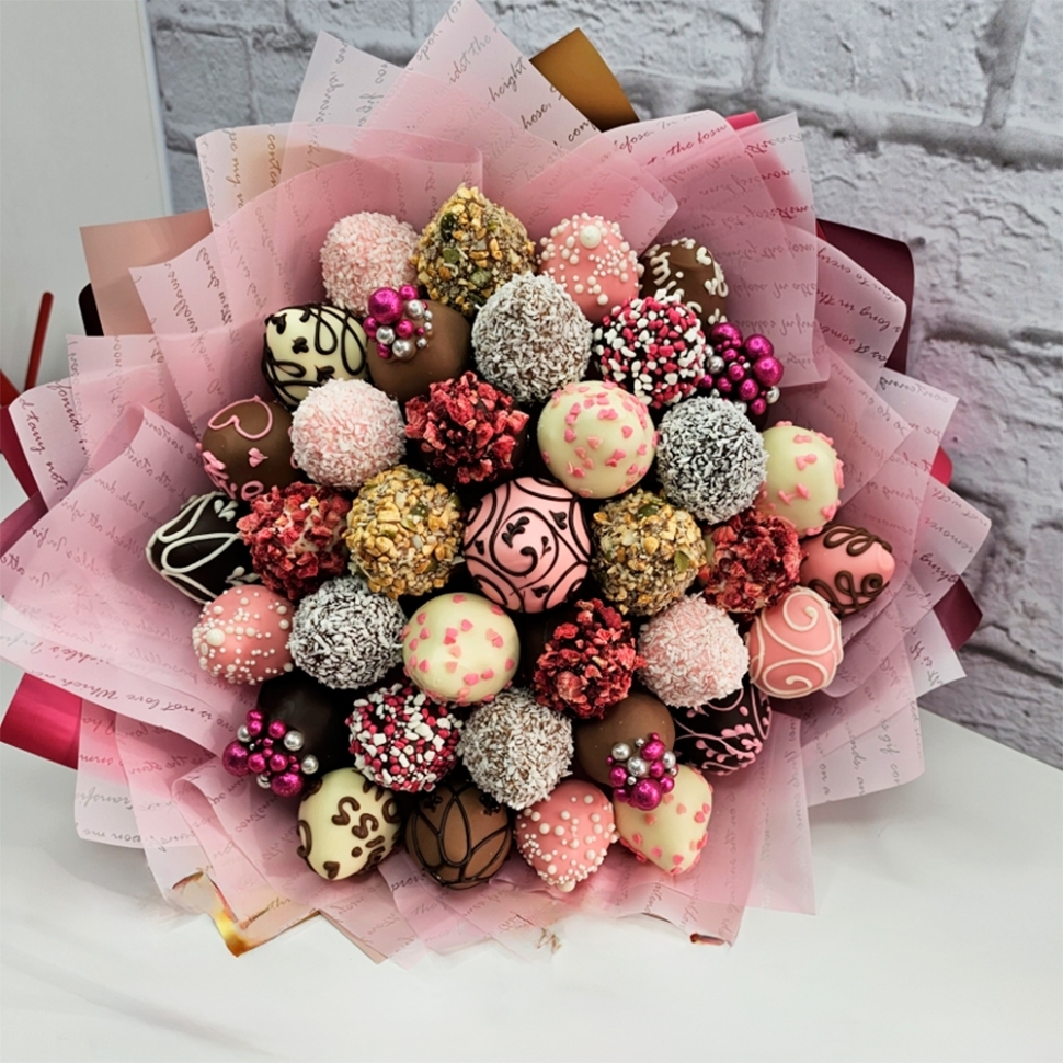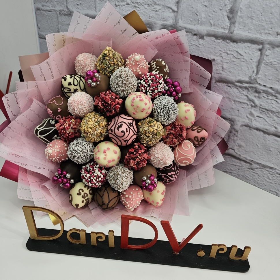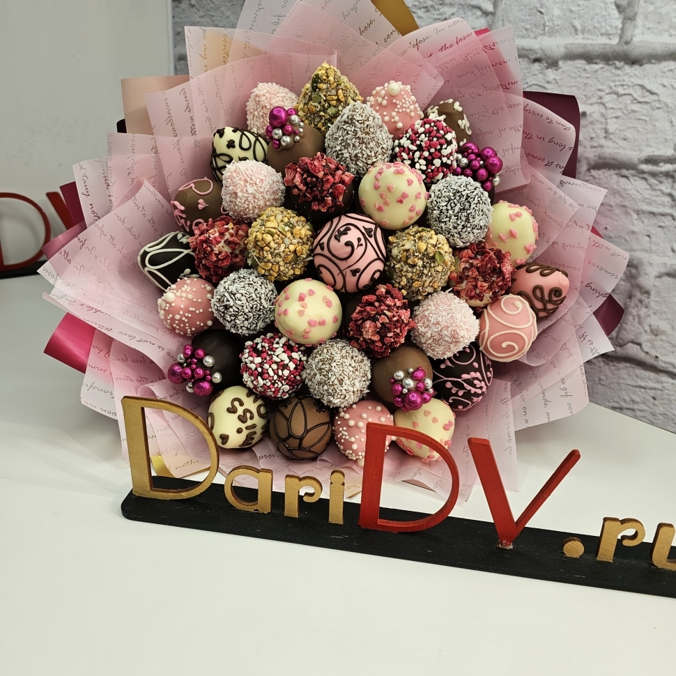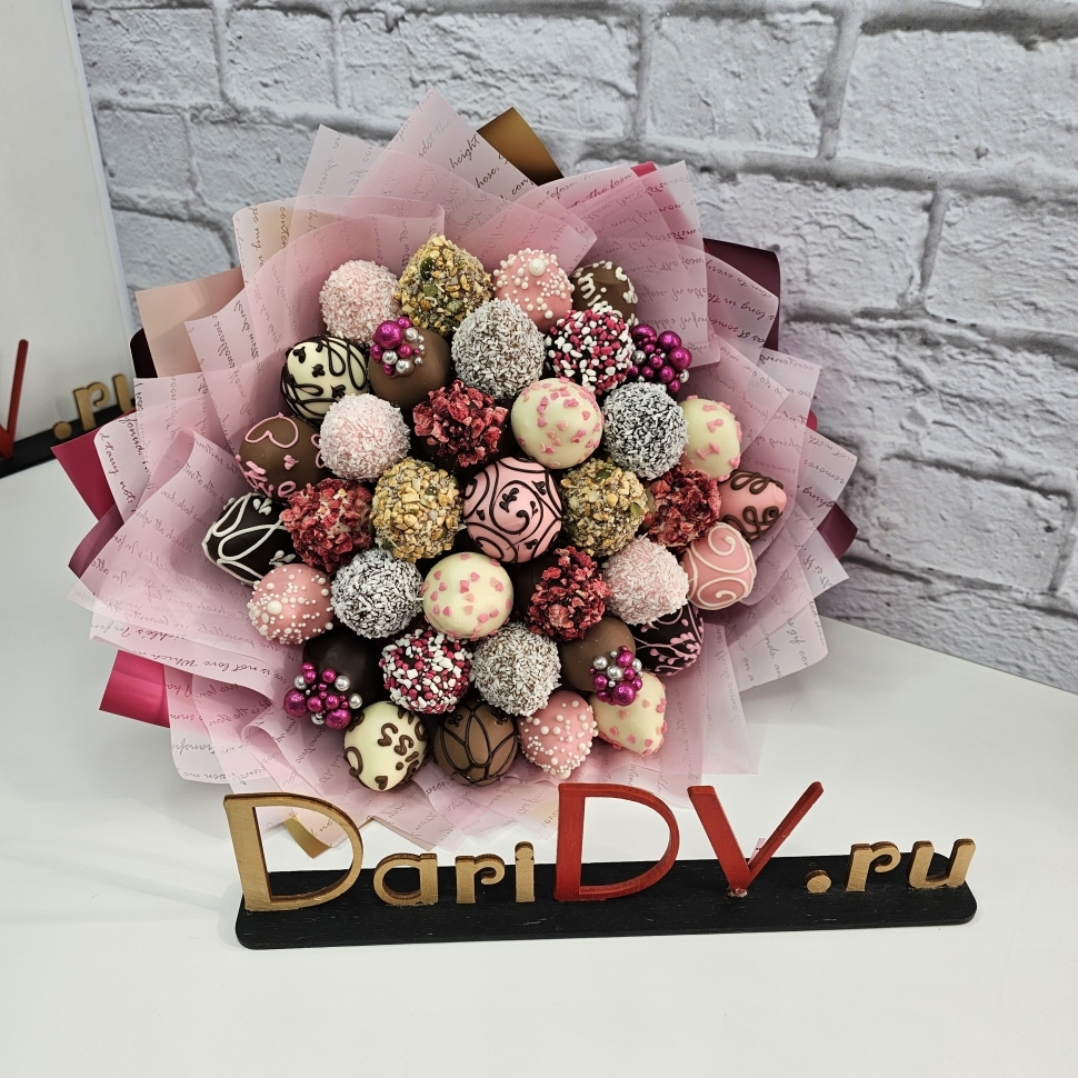 Уникальный дизайн и высокое качествоКаждая ягода в букете облита бельгийским шоколадом - белым, молочным или темным. Украшением служат сублимированная малина, посыпка из дробленных орехов, сладкая кондитерская посыпка и кокосовая стружка. Все это создает неповторимый вкус и аромат, который запоминается надолго.