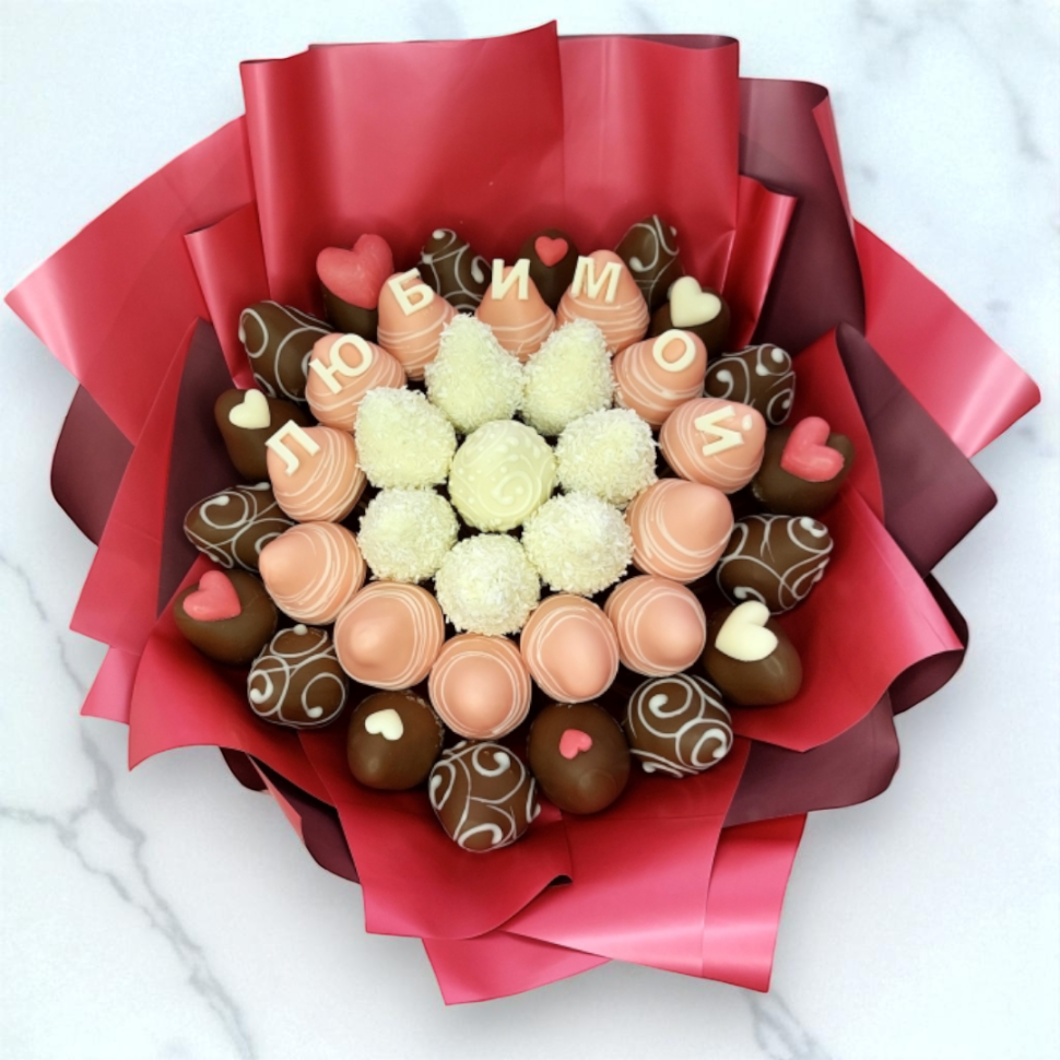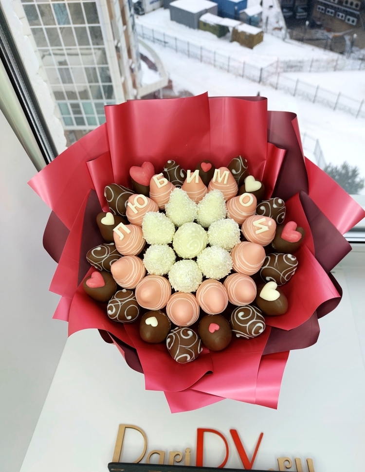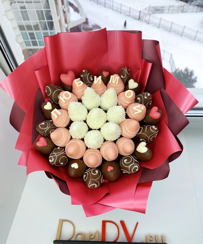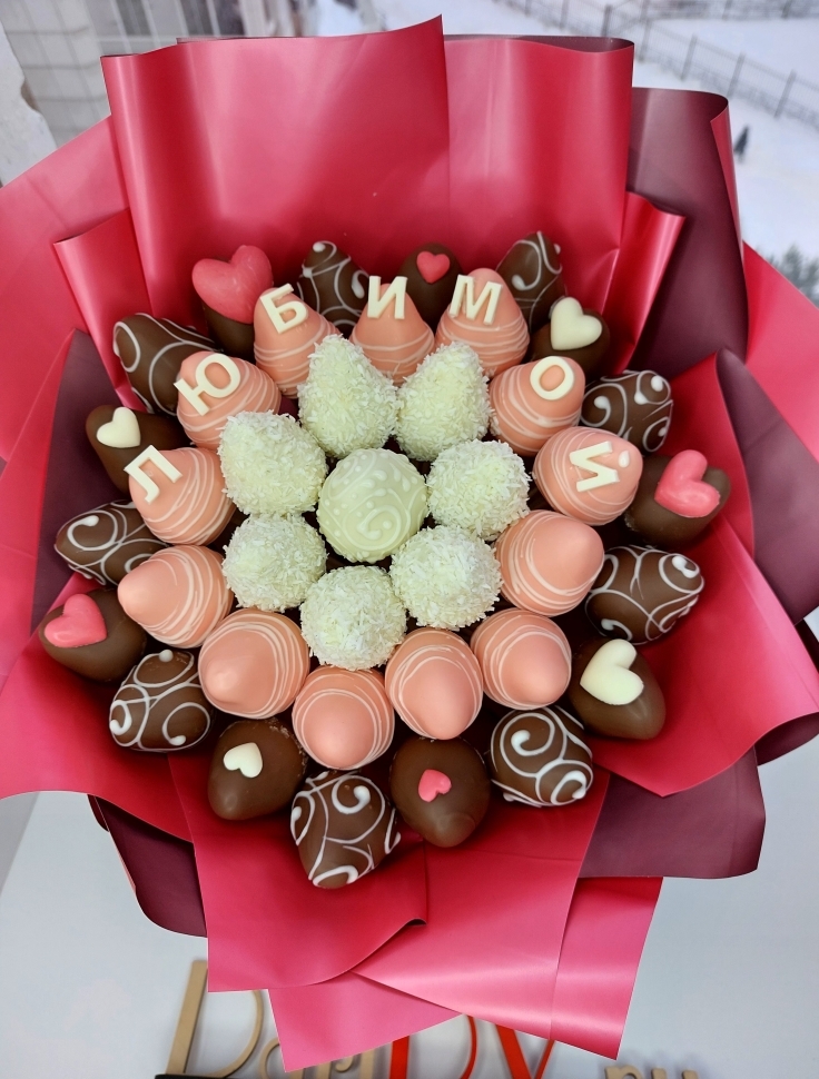 Неповторимый состав букетаУникальность букета в его составе. 22 ягоды клубники облачены в бельгийский белый шоколад, еще 17 - в молочный шоколад. Каждая ягода завершает композицию уникальными узорами ручной работы. Все это украшено кокосовой стружкой и шоколадной надписью из белого шоколада "Любимой".