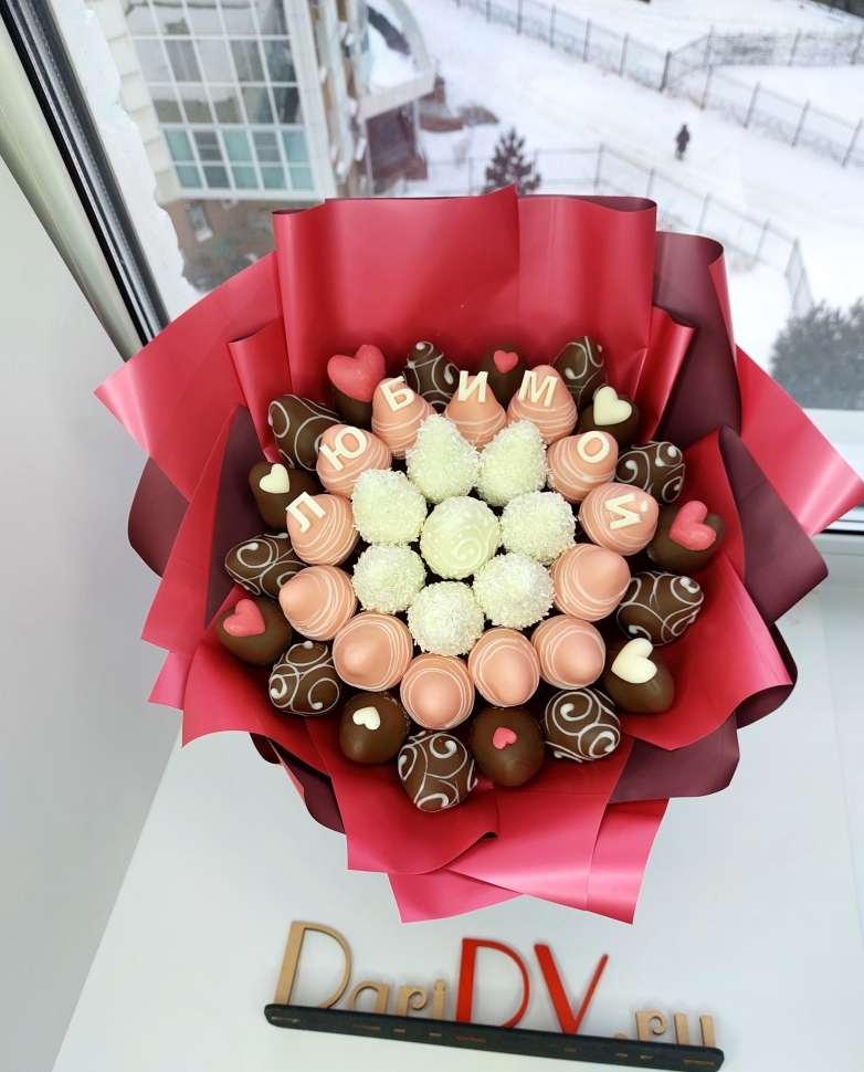 Букет на любой праздникБукет 39 клубник в шоколаде от DariDV станет отличным подарком на 1 Сентября, 14 февраля, 8 Марта, 9 Мая, День Рождения, Новый Год, День учителя, свадьбу и любой другой праздник. Он прекрасно подойдет как для взрослых, так и для детей, став их самым запоминающимся и желанным подарком.
