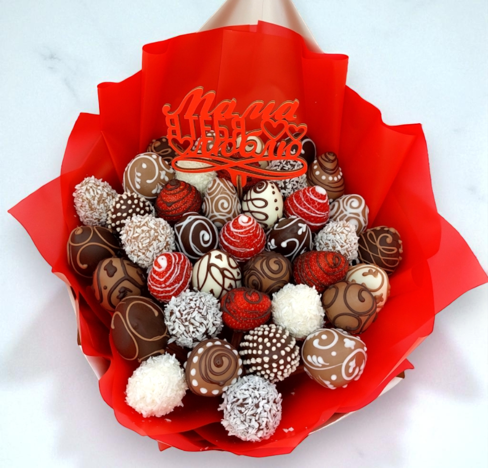 Состав букетаВ основу композиции легли яркие, сочные клубники. Они покрыты тремя видами бельгийского шоколада: белым, молочным и темным. Шоколад дополнительно украшен кокосовой стружкой и узорами ручной работы. Каждая ягода – это произведение искусства, созданное с любовью и заботой.