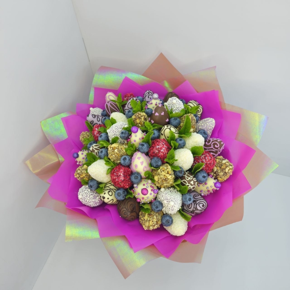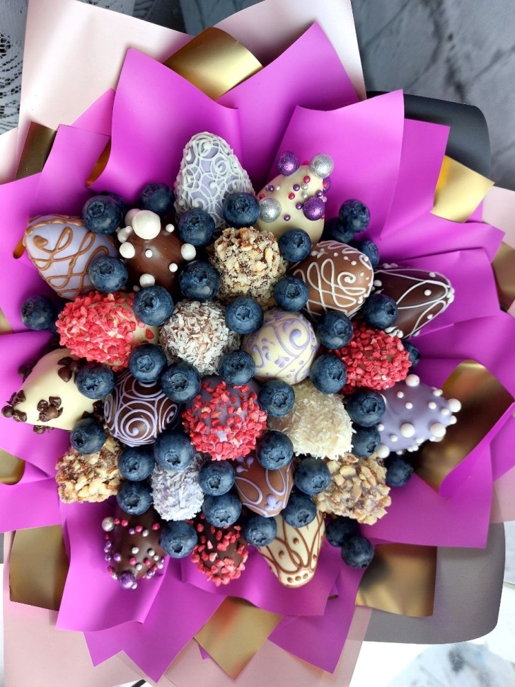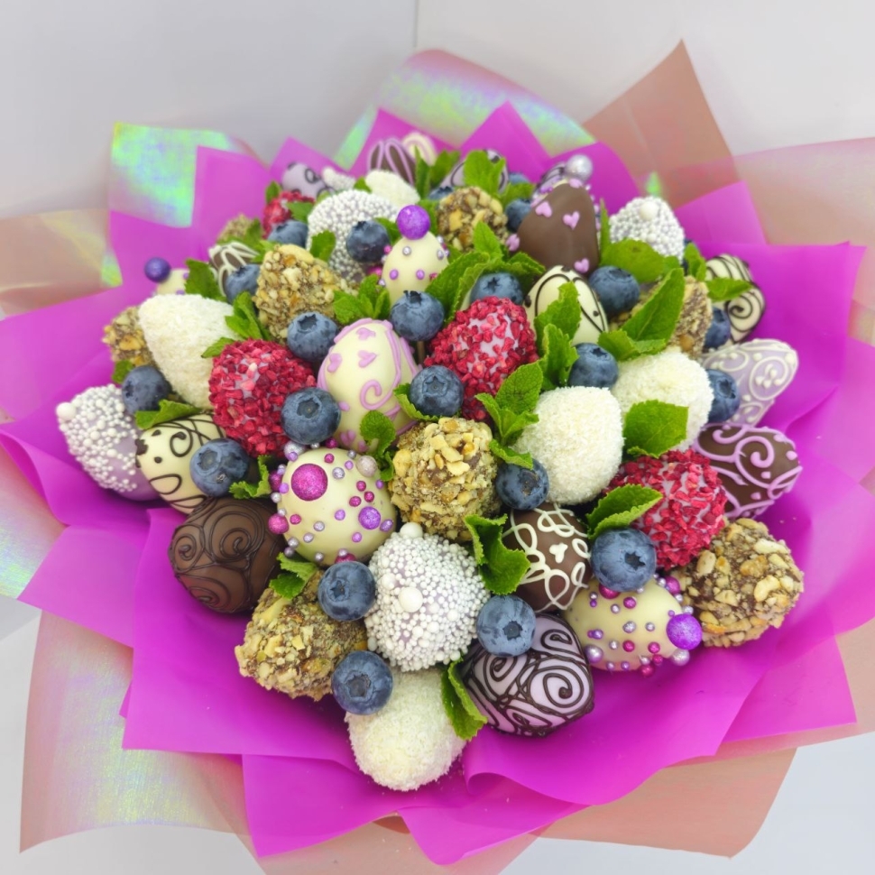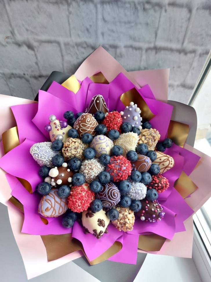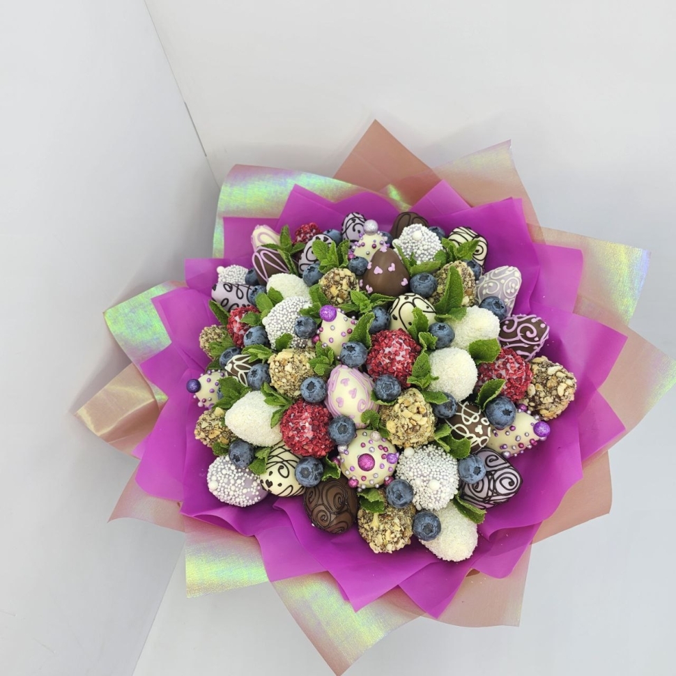 Пришло время порадовать своих близких уникальным подарком от бренда DariDV. Представляем Вашему вниманию букет из 45 штук клубники в бельгийском шоколаде, украшенный свежей голубикой и мятой. Это идеальный вариант для подарка ребенку, жене, маме или любимой. Такой букет будет востребован и в качестве презента преподавателю, учителю, коллеге и даже начальнику.