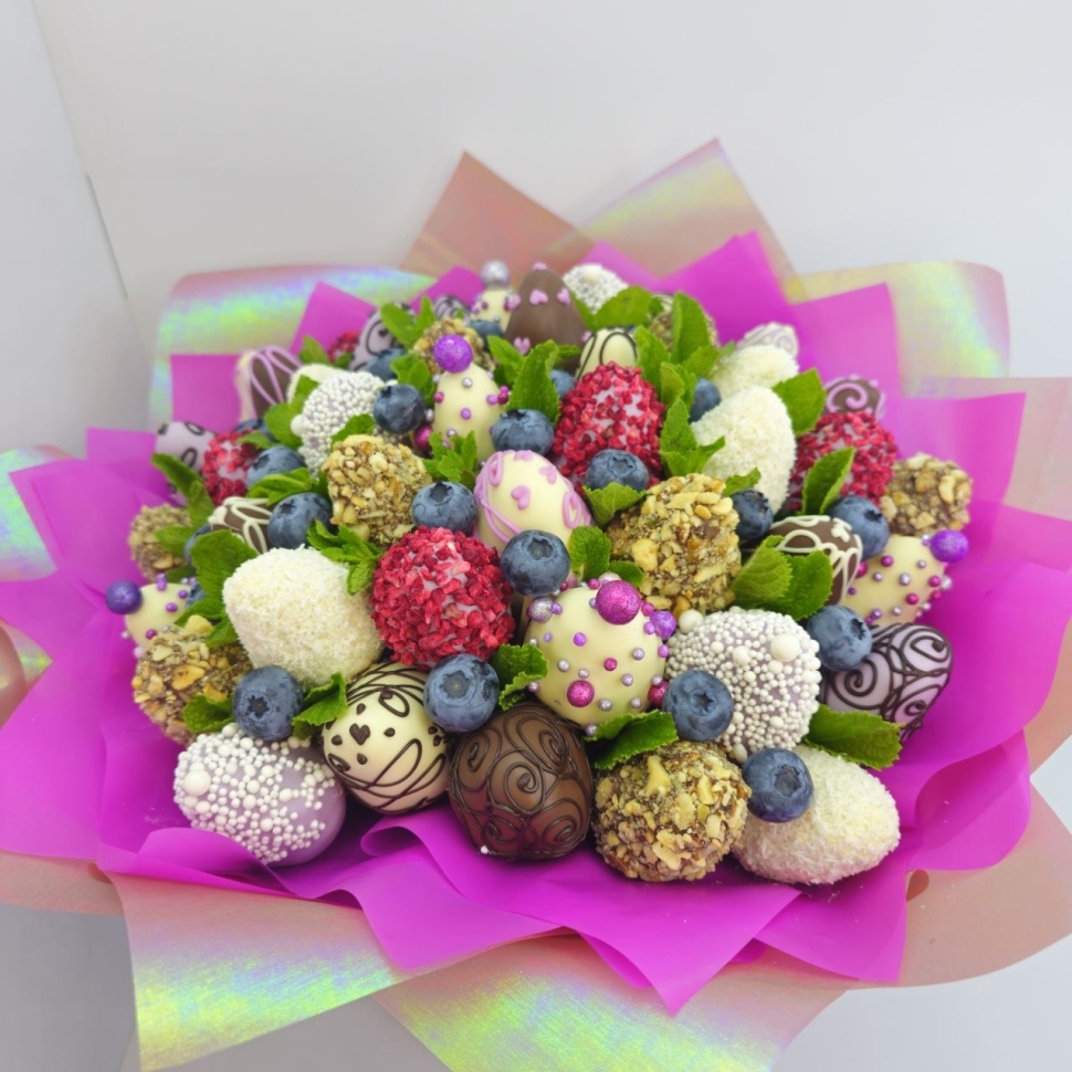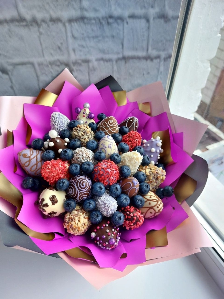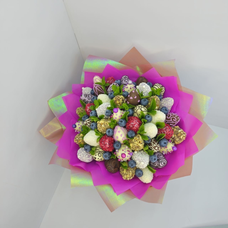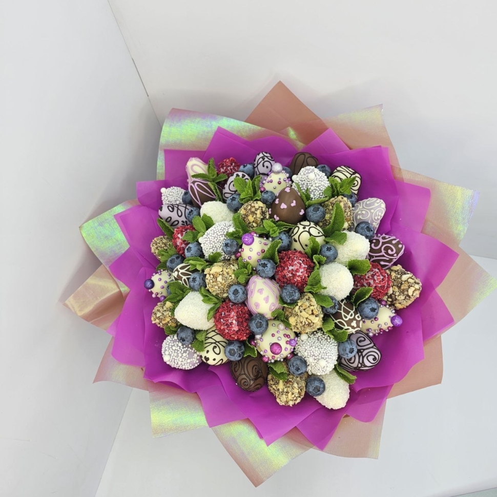 Пришло время порадовать своих близких уникальным подарком от бренда DariDV. Представляем Вашему вниманию букет из 45 штук клубники в бельгийском шоколаде, украшенный свежей голубикой и мятой. Это идеальный вариант для подарка ребенку, жене, маме или любимой. Такой букет будет востребован и в качестве презента преподавателю, учителю, коллеге и даже начальнику.