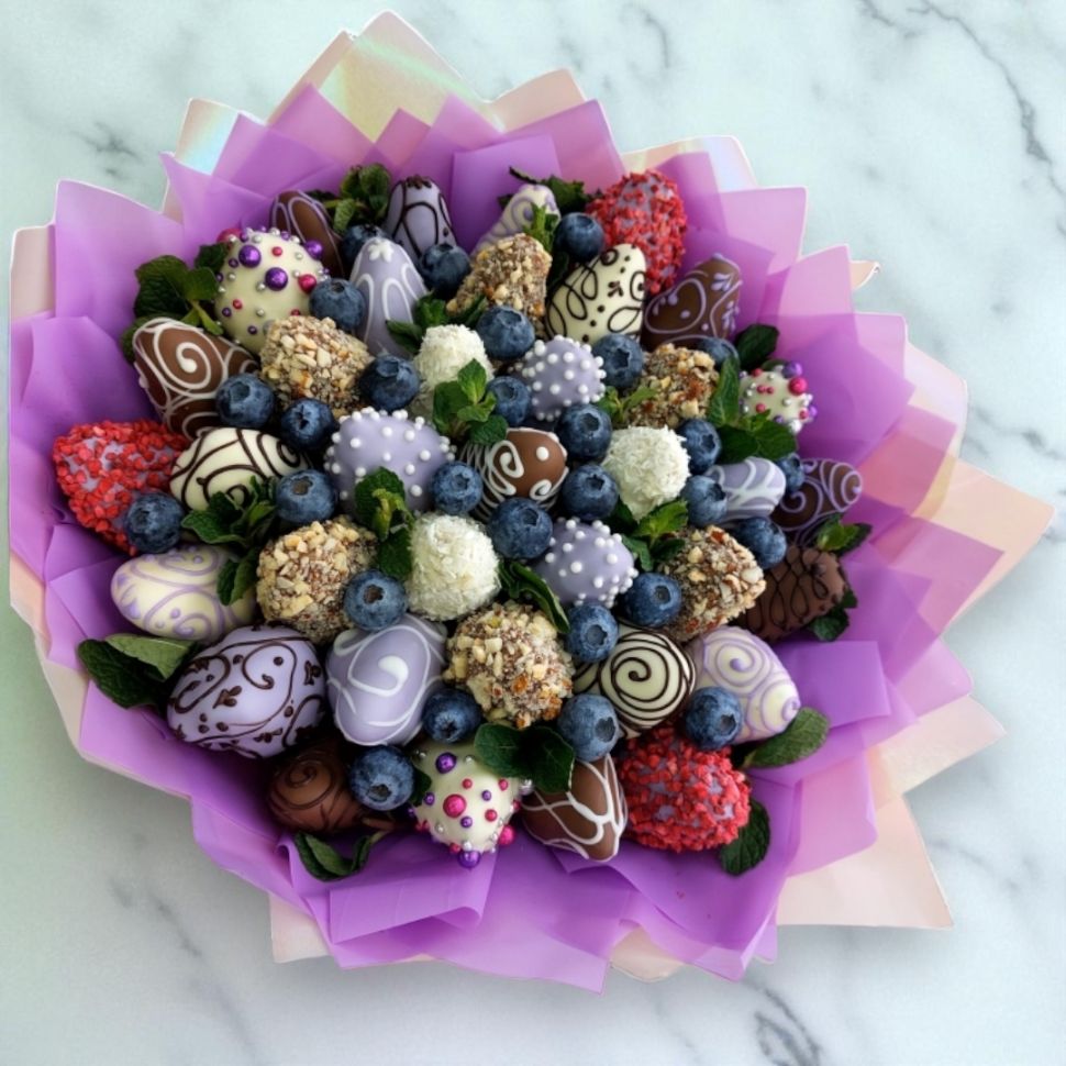 Вид шоколада и состав букетаСладкое удовольствие начинается с бельгийского молочного шоколада, в котором покрыта клубника. Любители более нежного вкуса оценят букет с клубникой в бельгийском белом шоколаде. А для придания изысканности и разнообразия в букет добавлены свежая черника и мята. Узоры ручной работы, ореховая и сладкая кондитерская посыпки лишь подчеркивают вкусовую гамму этого удивительного подарка.