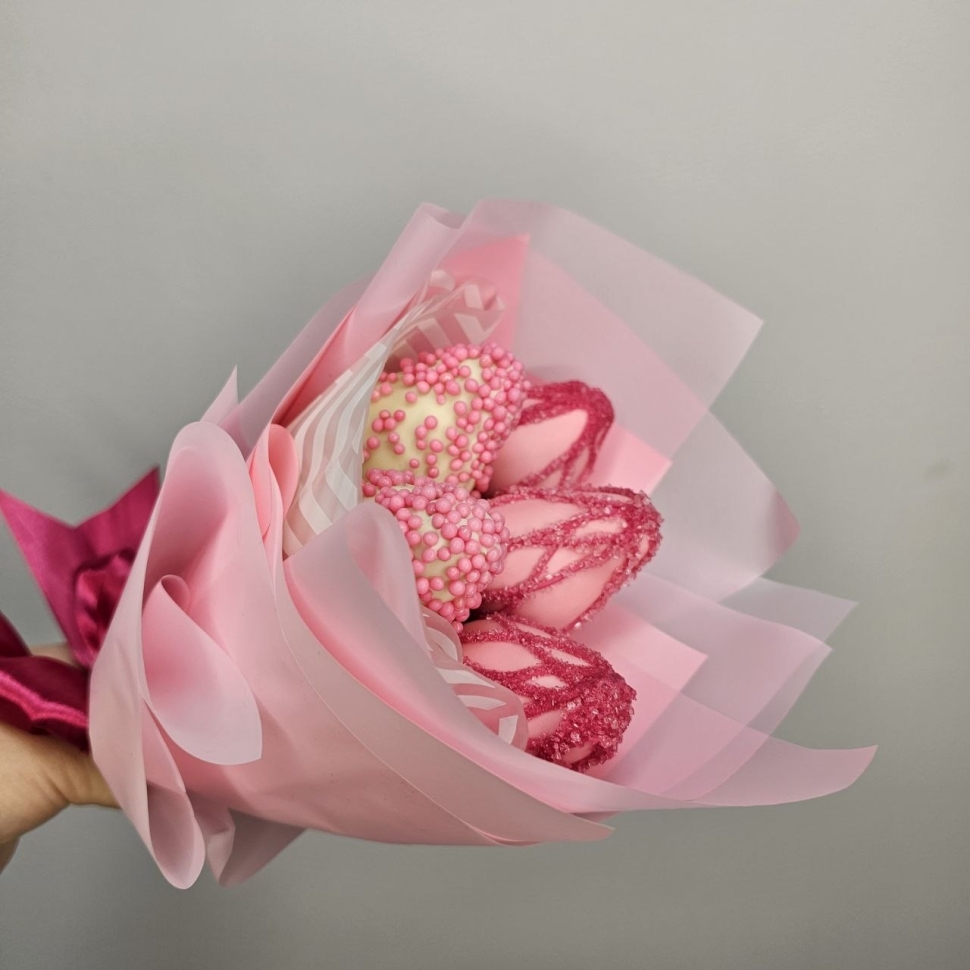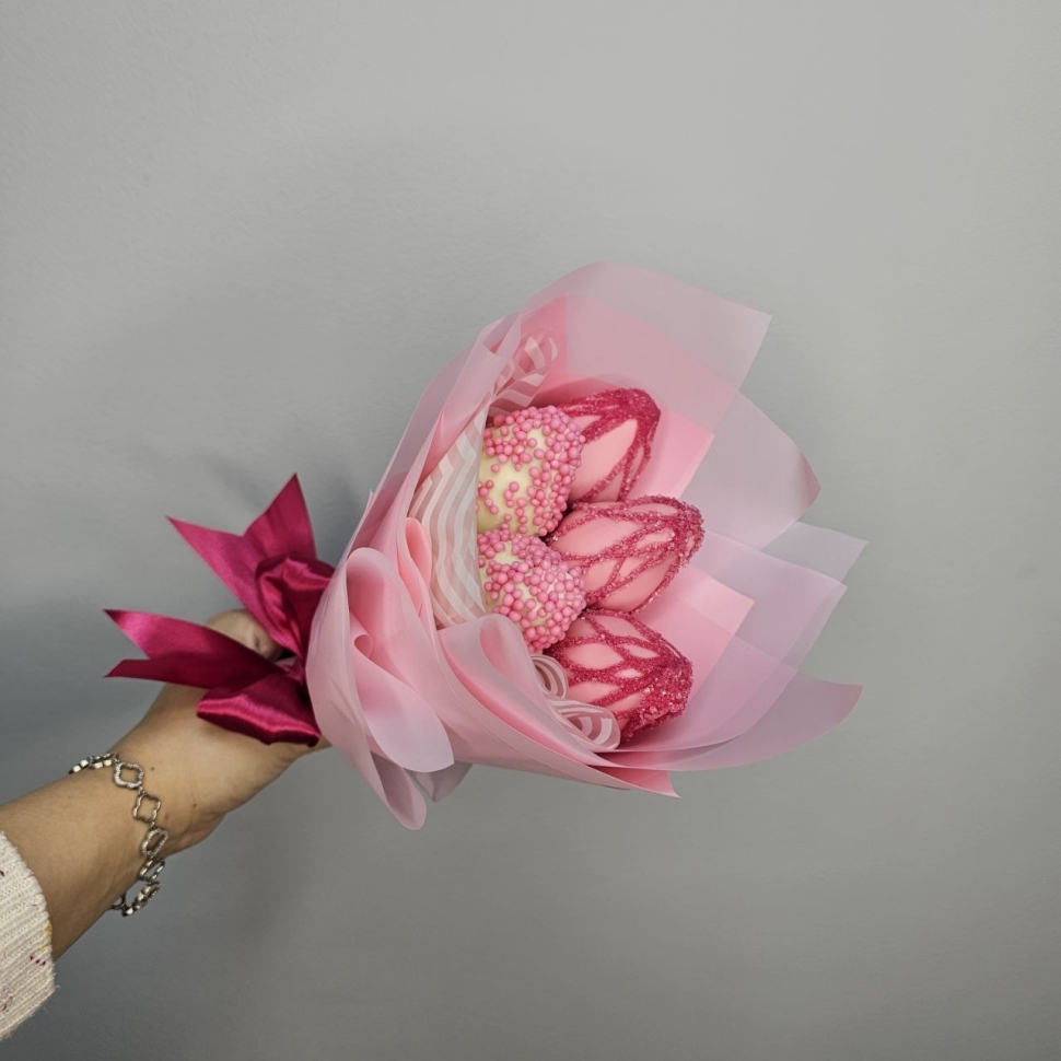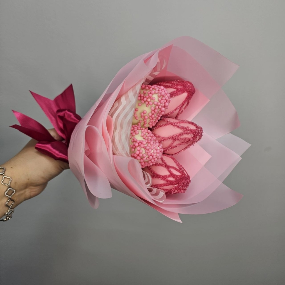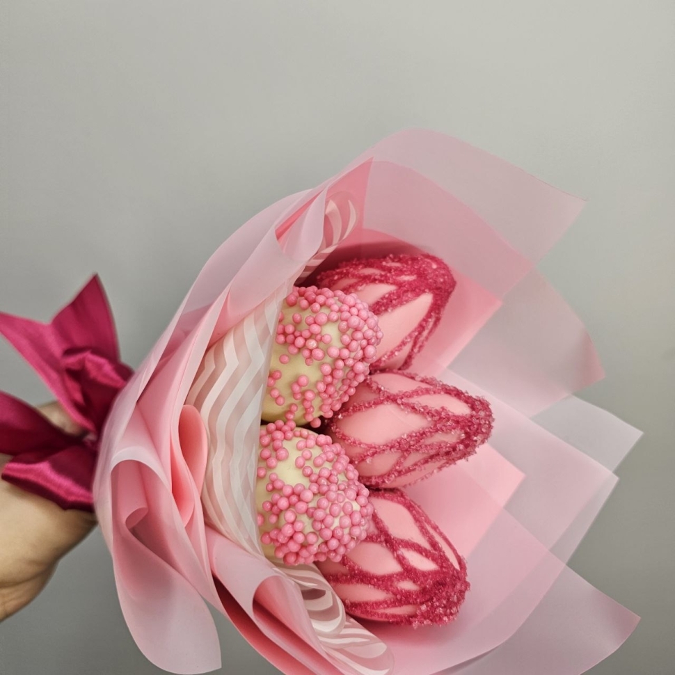 Состав букетаКомпозиция этого букета состоит из пяти сочных ягод клубники, покрытых бельгийским белым шоколадом. Такой шоколад отличается своим нежным вкусом и ароматом, идеально сочетающимся с кисловатым привкусом клубники. Каждая ягода украшена сладкой кондитерской посыпкой, добавляющей букету еще большей изысканности.