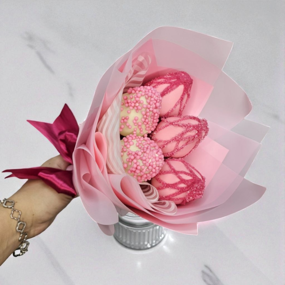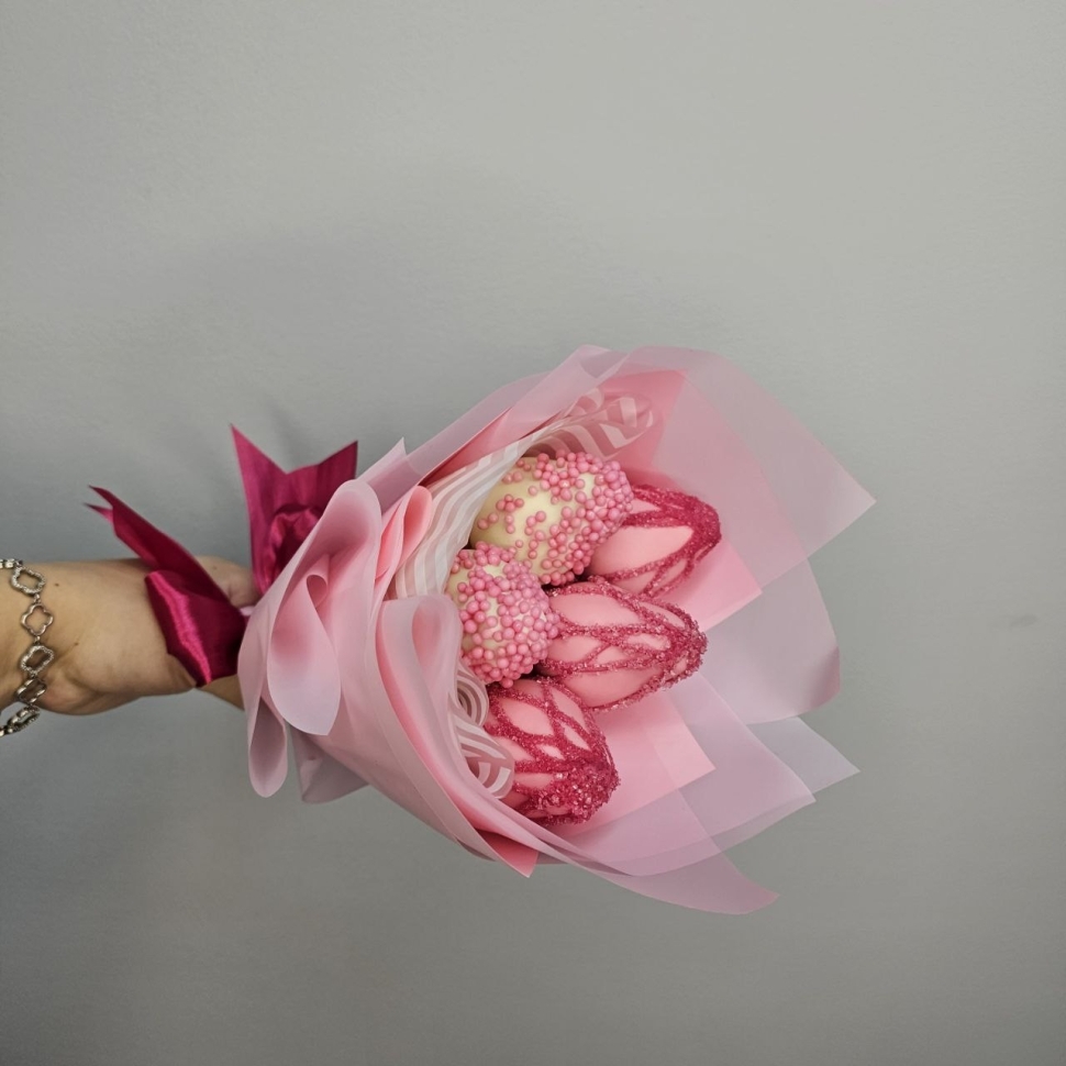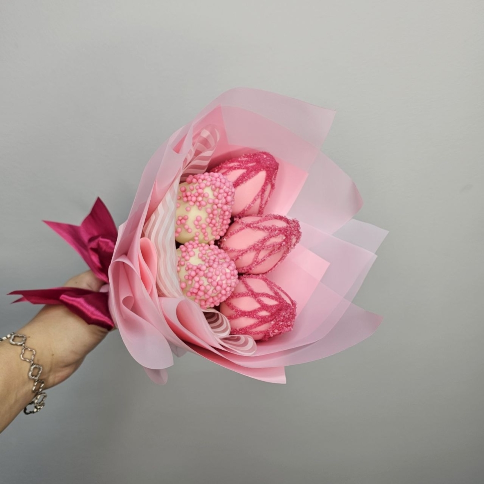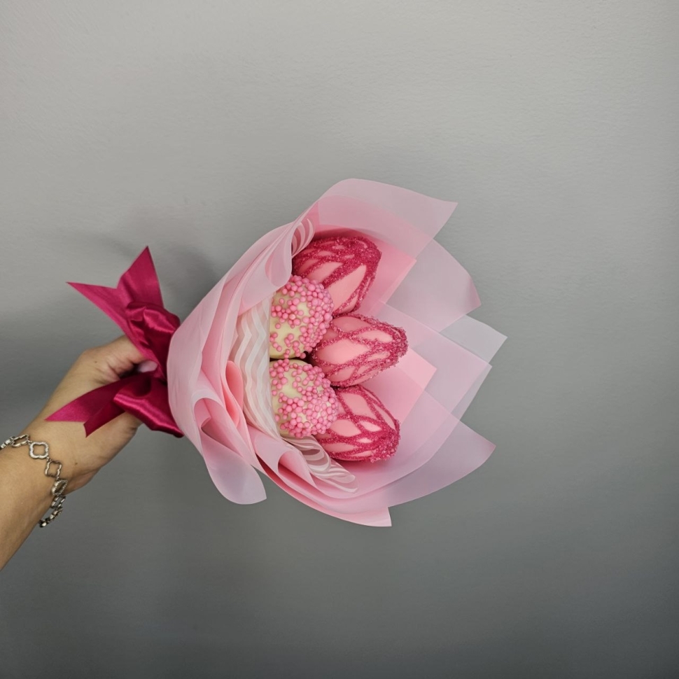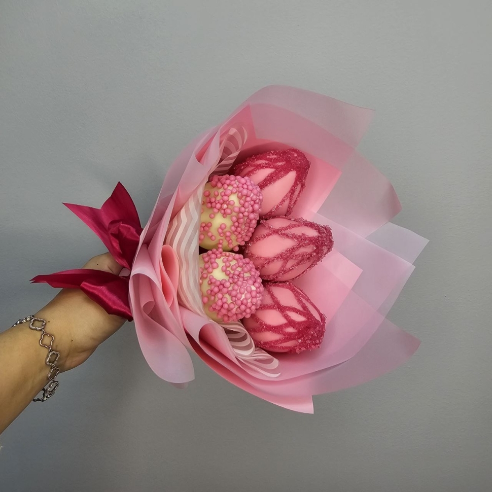 Состав букетаКомпозиция этого букета состоит из пяти сочных ягод клубники, покрытых бельгийским белым шоколадом. Такой шоколад отличается своим нежным вкусом и ароматом, идеально сочетающимся с кисловатым привкусом клубники. Каждая ягода украшена сладкой кондитерской посыпкой, добавляющей букету еще большей изысканности.