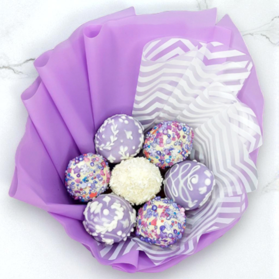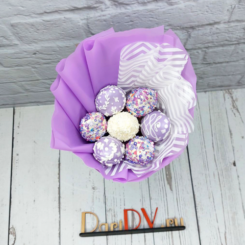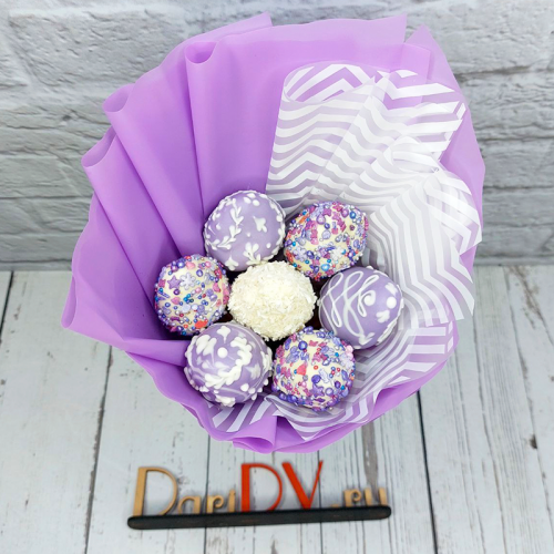 Особенности букета клубник в шоколадеБукет представляет собой 7 свежих клубник, покрытых бельгийским белым шоколадом. Каждая ягода украшена сладкой кондитерской посыпкой и узорами ручной работы. Дополнительный шарм букету придает кокосовая стружка. Весь букет аккуратно упакован в дизайнерскую упаковку, украшенную бантом из атласной ленты. Букет доступен в двух цветовых вариантах: белом и фиолетовом.
