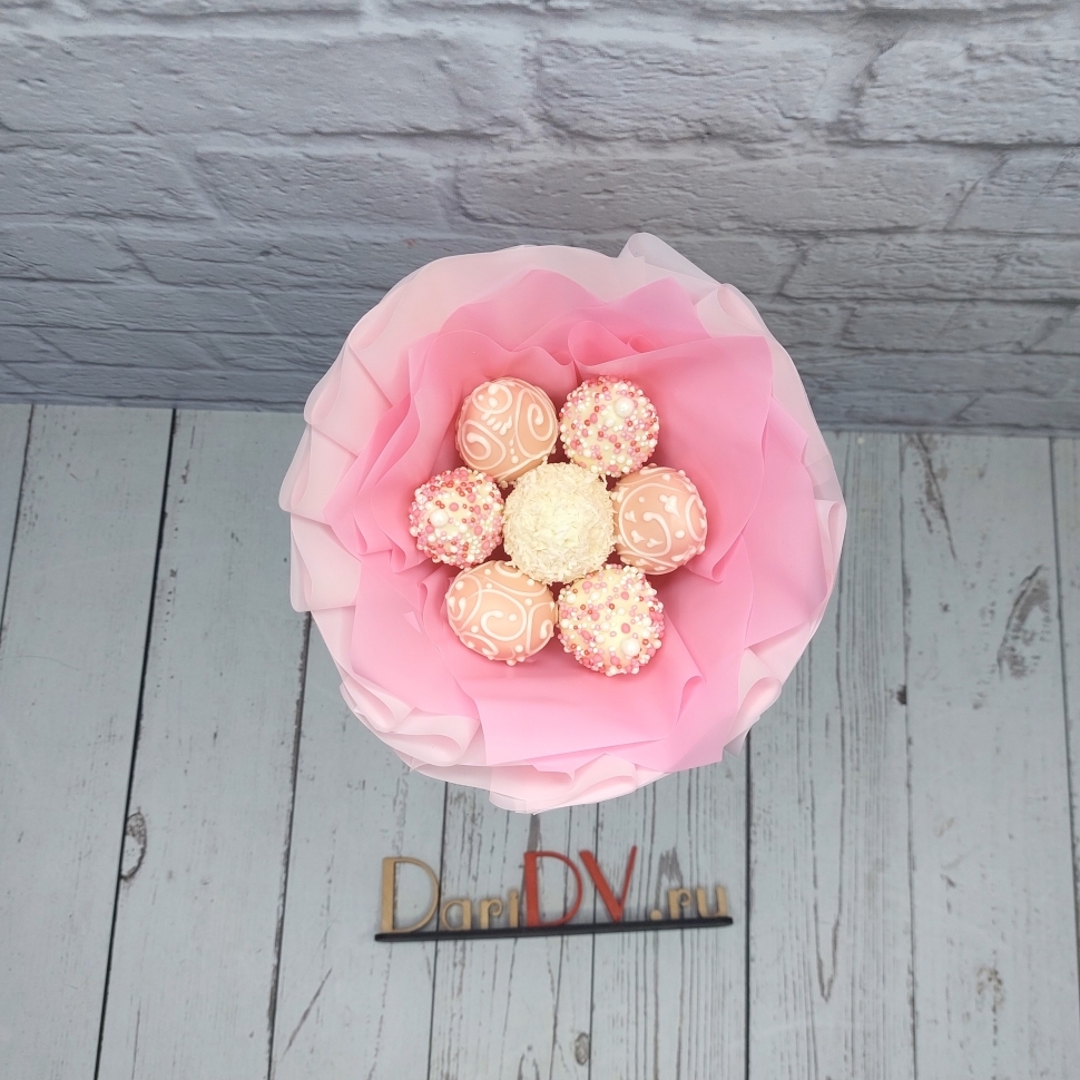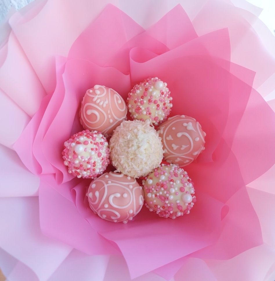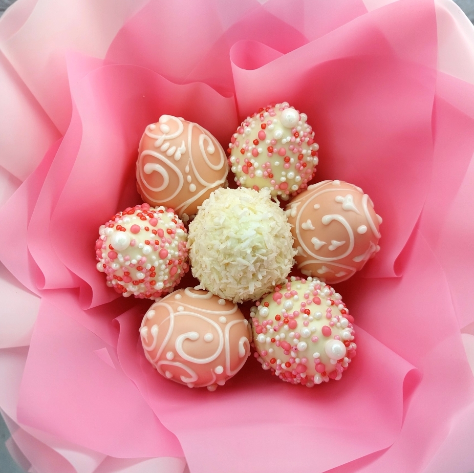 Ручная работаКаждый букет украшен уникальными узорами ручной работы, сладкой кондитерской посыпкой и кокосовой стружкой. Все это делает наш букет не просто вкусным лакомством, но и настоящим произведением искусства.