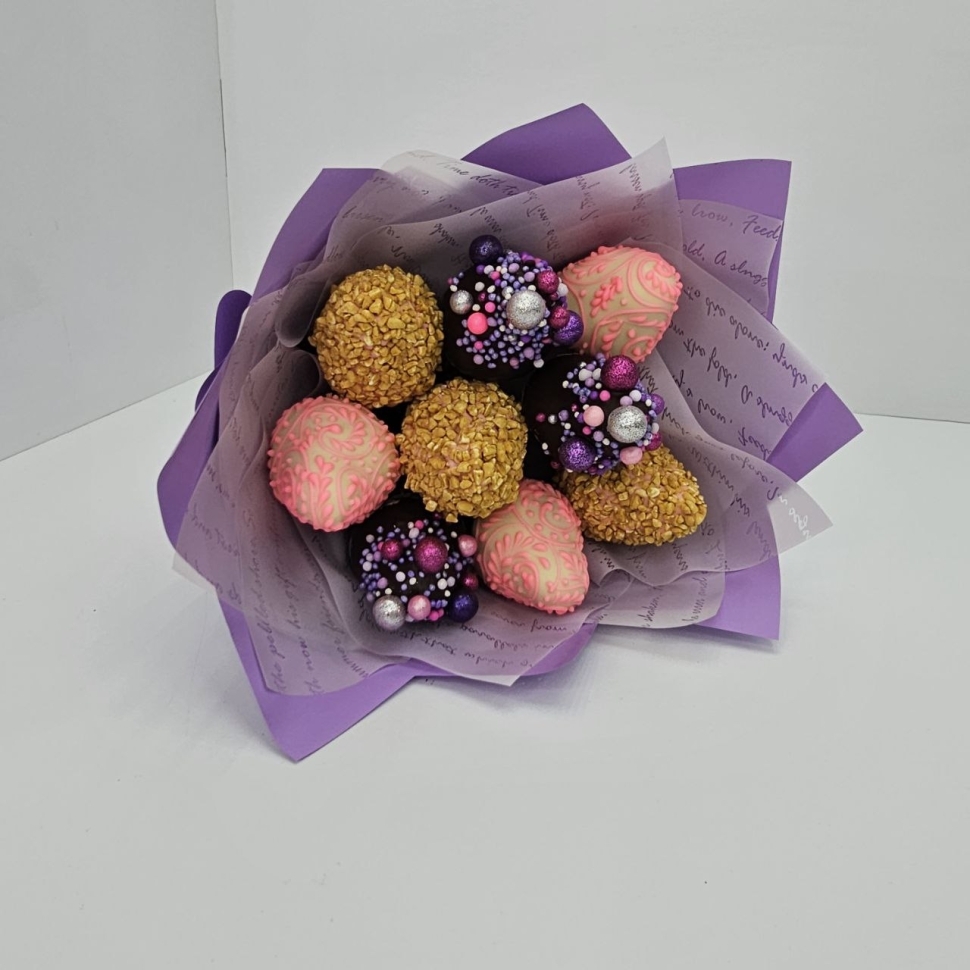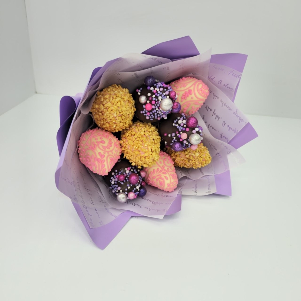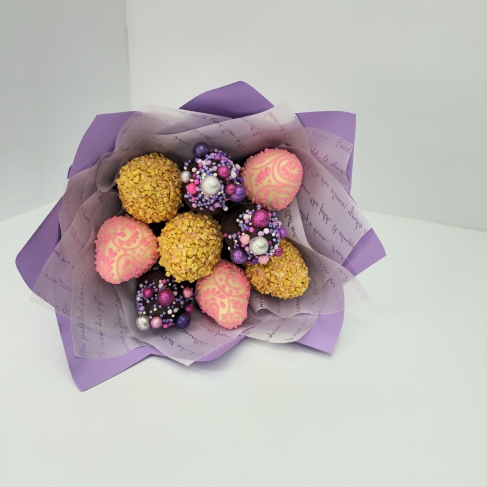 Букет 9 клубник в шоколаде - подарок для всехБукет подойдет в качестве подарка для коллеги, преподавателя, мужа, ребенка или любимой. Он будет радовать и удивлять, добавляя ярких красок в повседневную жизнь и особые моменты.