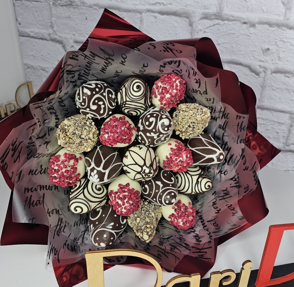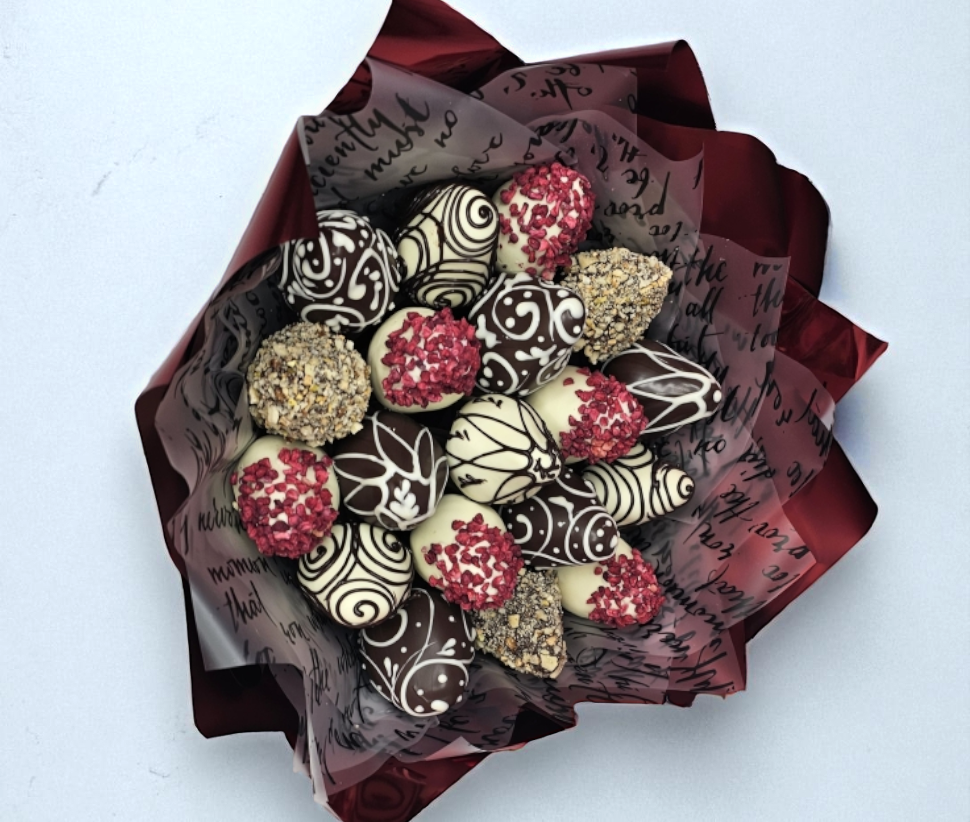 Состав букетаБукет включает в себя 19 ягод: 13 ягод утопают в белом шоколаде, а остальные 6 - в темном. Но это не все: добавление сублимированной малины и ореховой посыпки из дробленных орехов делают букет еще более привлекательным. А узоры ручной работы и дизайнерская упаковка подчеркивают эксклюзивность подарка.