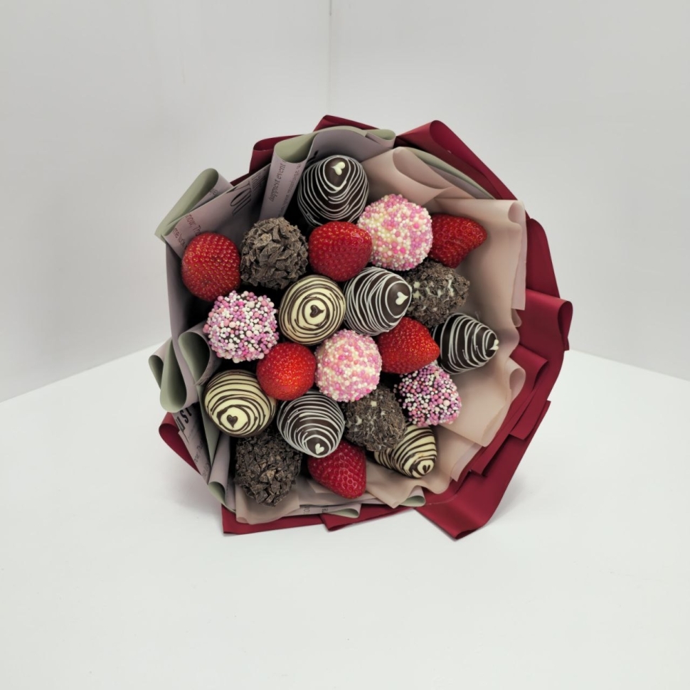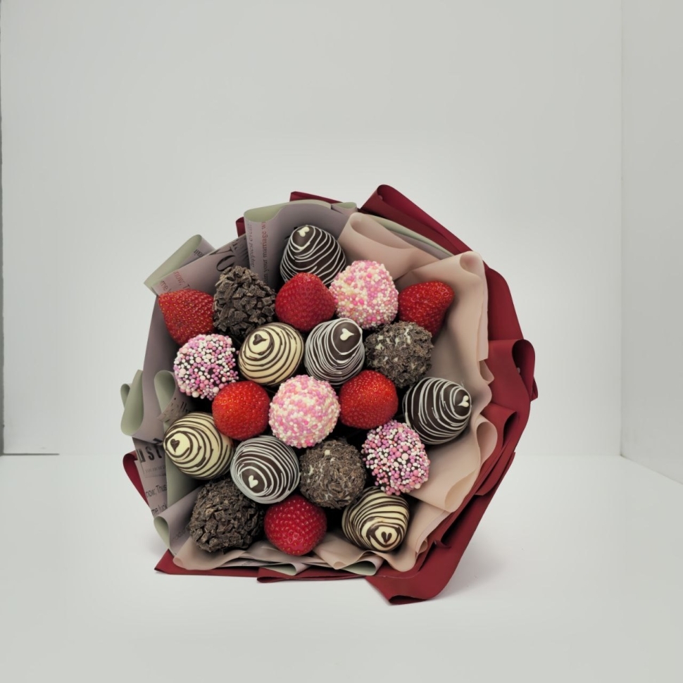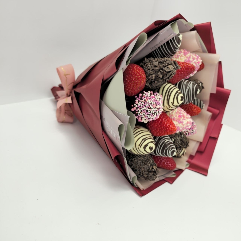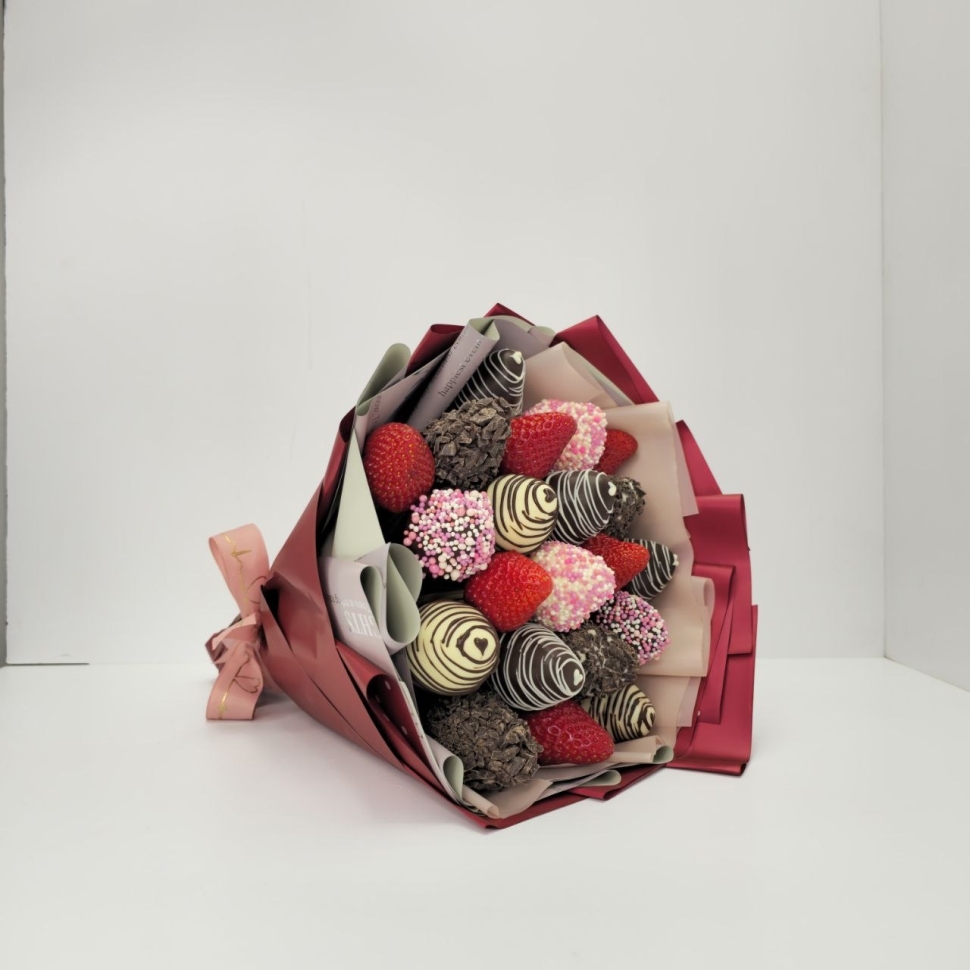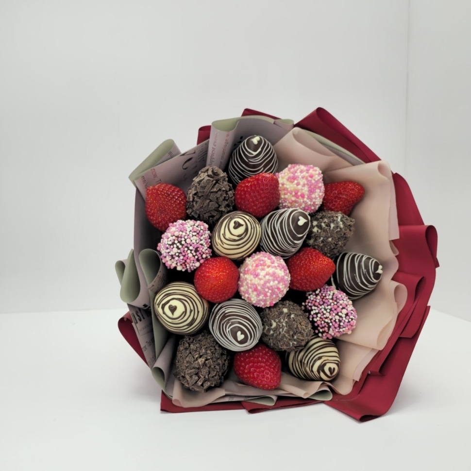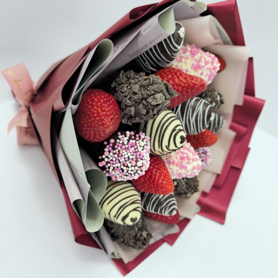 Декор и упаковкаВсе ягоды украшены узорами ручной работы, шоколадной крошкой и сладкой кондитерской посыпкой. Каждый букет упаковывается в дизайнерскую упаковку и украшается бантом из атласной ленты, что делает его еще более привлекательным и элегантным.