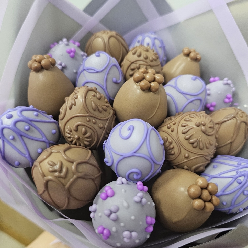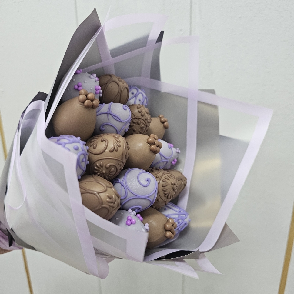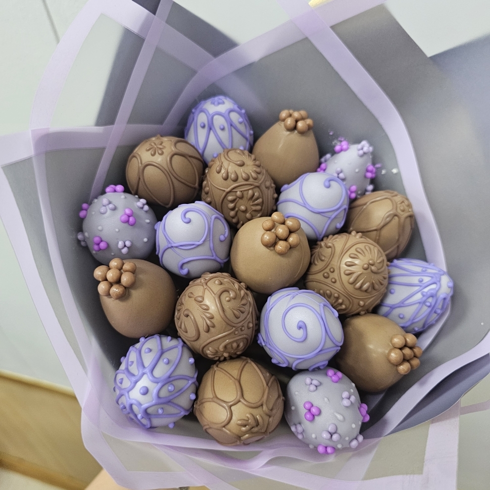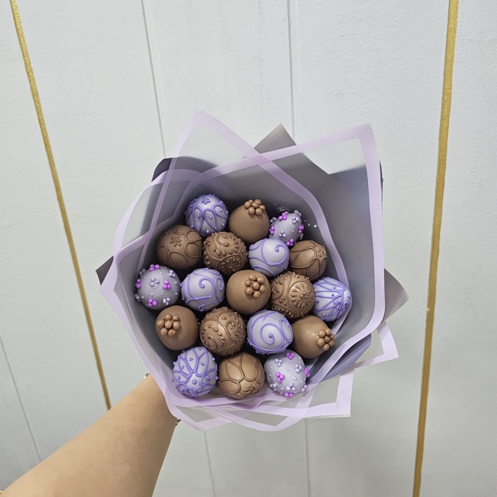 Состав и дизайнБукет состоит из 19 ягод клубники, 10 из которых покрыты бельгийским молочным шоколадом, а остальные 9 – белым. Все ягоды украшены сладкой кондитерской посыпкой и узорами ручной работы. Букет аккуратно упакован в дизайнерскую упаковку и завязан бантом из атласной ленты. Цветовое решение в шоколадно-фиолетовых тонах делает его еще более привлекательным.