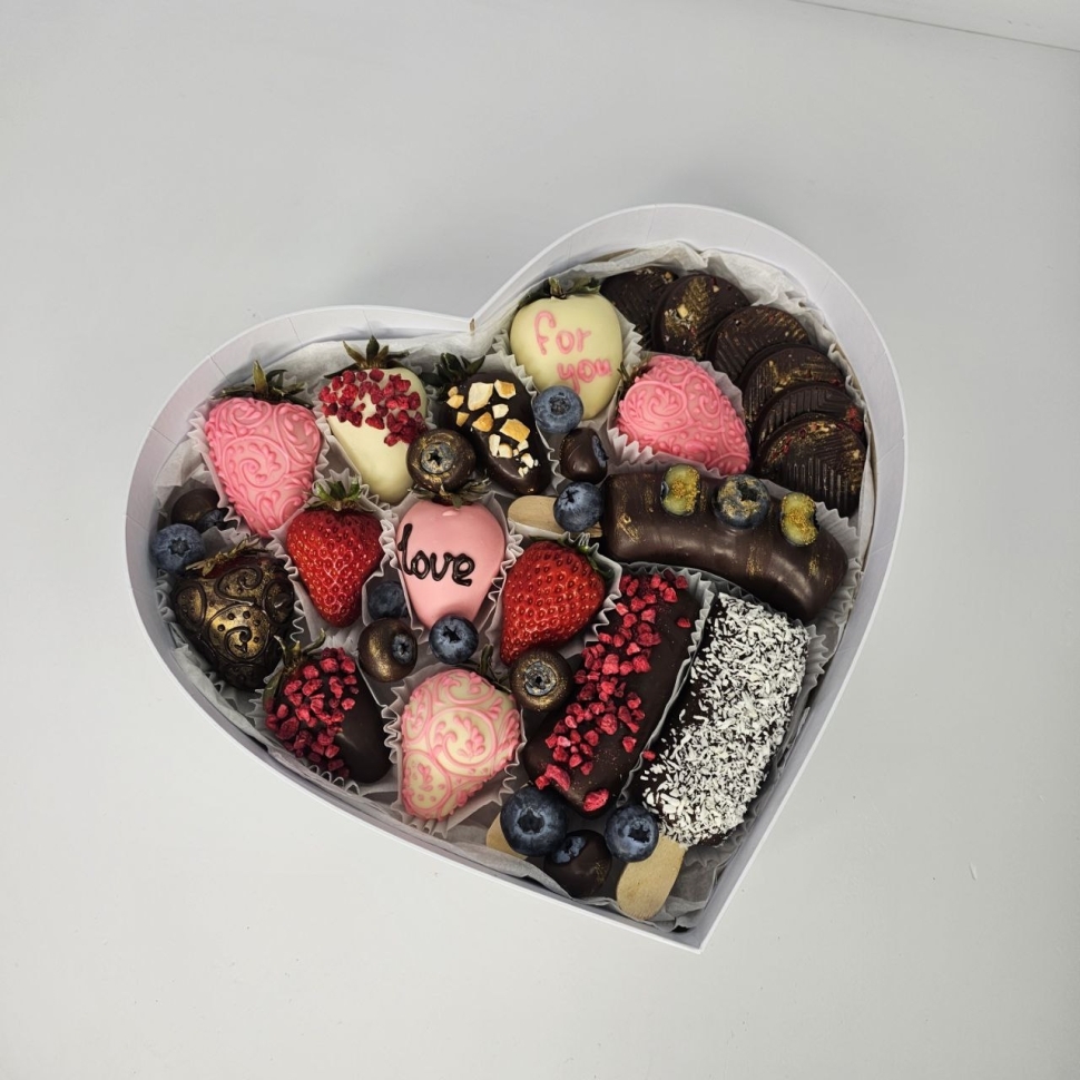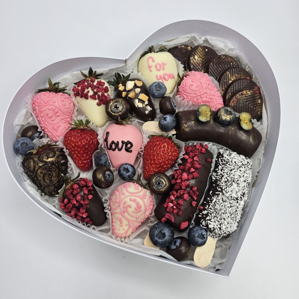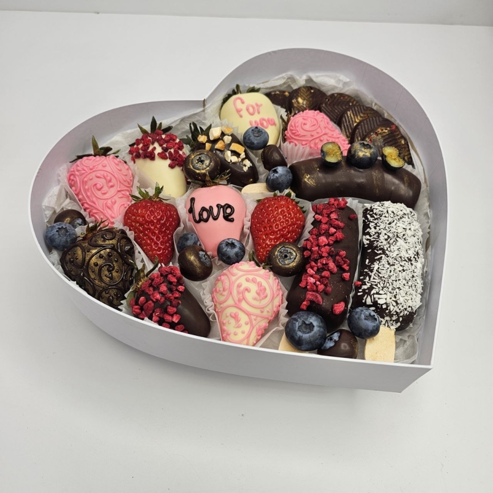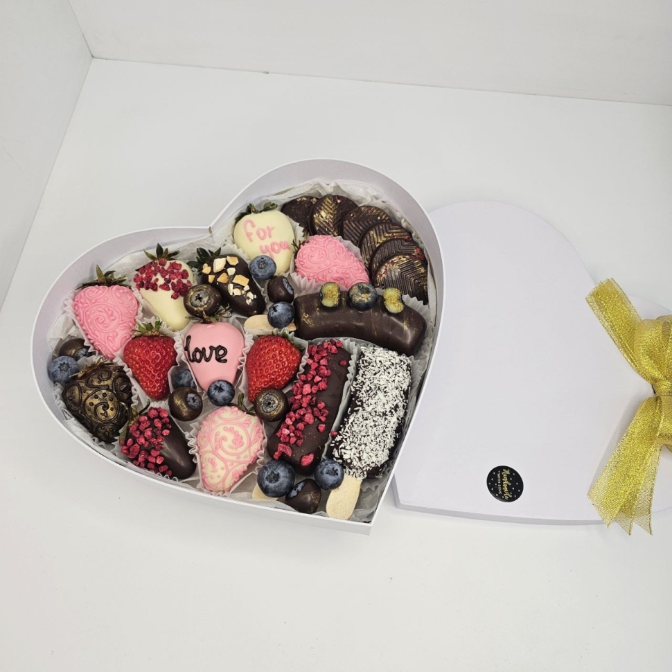 Уникальность составаСостав данного десерта впечатляет своим разнообразием. Композиция включает в себя 9 ягод, 6 из которых — свежая клубника, обтянутая бельгийским белым шоколадом, а оставшиеся 3 штуки — в бельгийском темном шоколаде. Кроме того, в сердце прячутся 3 банана, покрытых темным бельгийским шоколадом и 2 свежих клубники. А также черника — одна в темном шоколаде, другая свежая. Украшением служат медианты из темного шоколада (6 шт), сублимированная малина, кокосовая стружка, кандурин и ореховая посыпка.