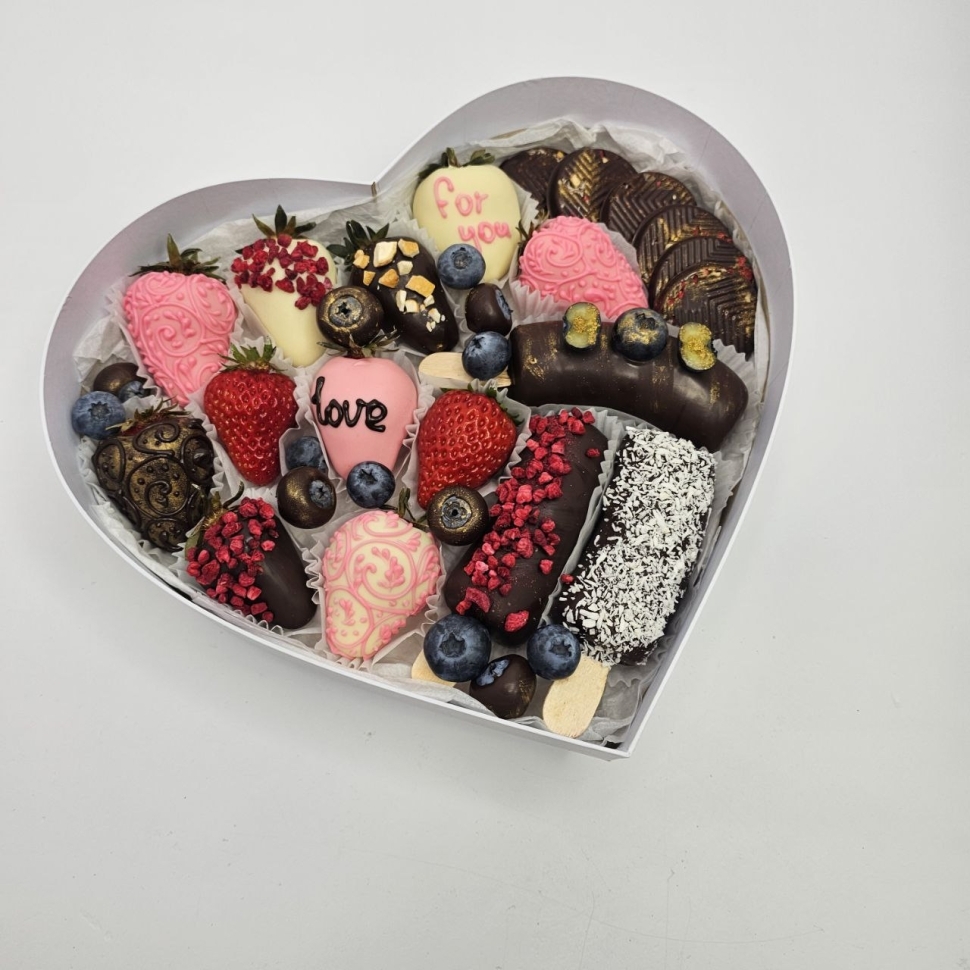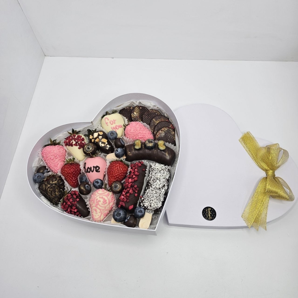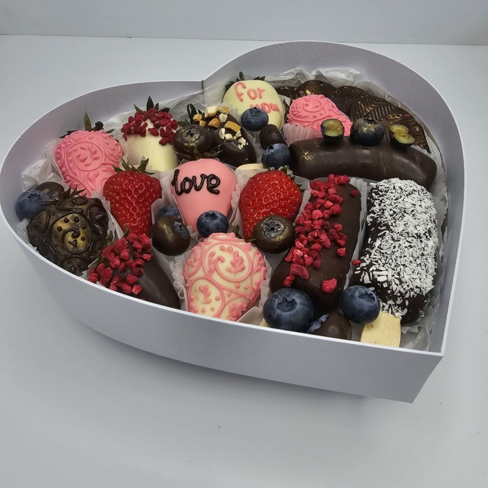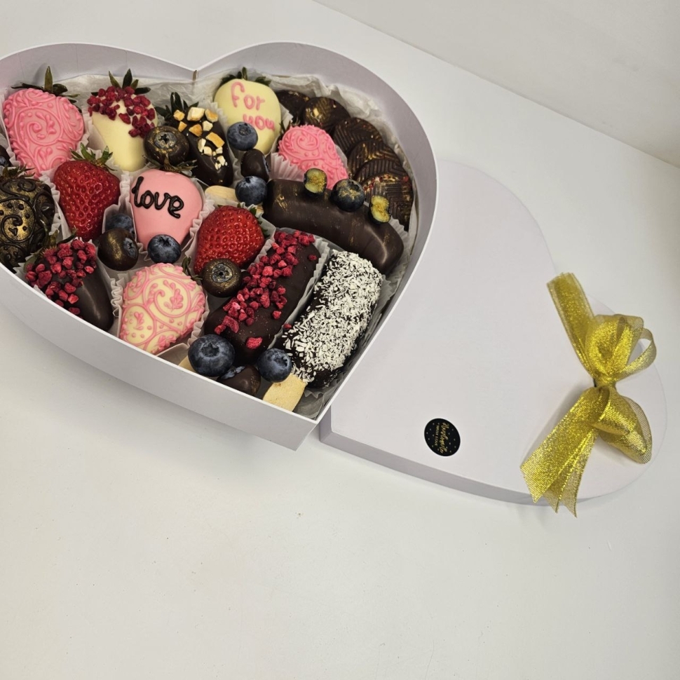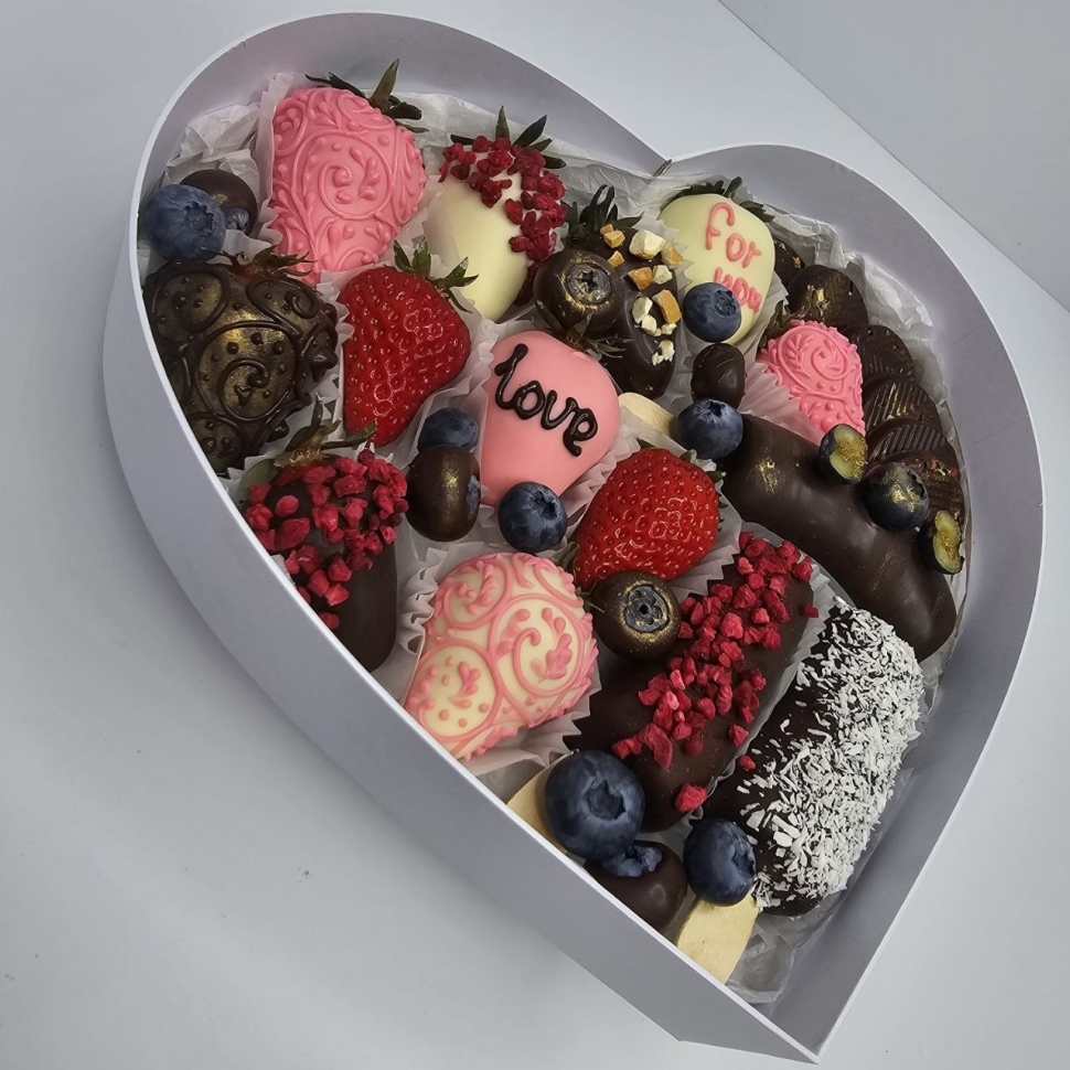 Уникальность составаСостав данного десерта впечатляет своим разнообразием. Композиция включает в себя 9 ягод, 6 из которых — свежая клубника, обтянутая бельгийским белым шоколадом, а оставшиеся 3 штуки — в бельгийском темном шоколаде. Кроме того, в сердце прячутся 3 банана, покрытых темным бельгийским шоколадом и 2 свежих клубники. А также черника — одна в темном шоколаде, другая свежая. Украшением служат медианты из темного шоколада (6 шт), сублимированная малина, кокосовая стружка, кандурин и ореховая посыпка.