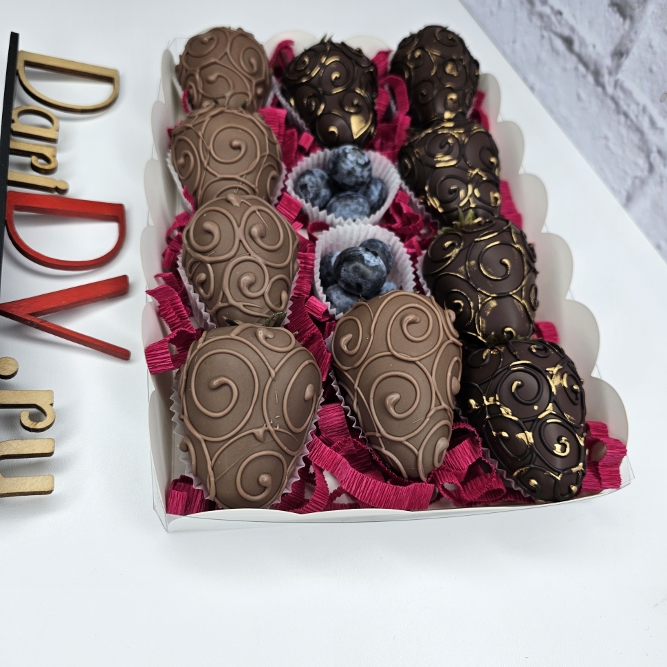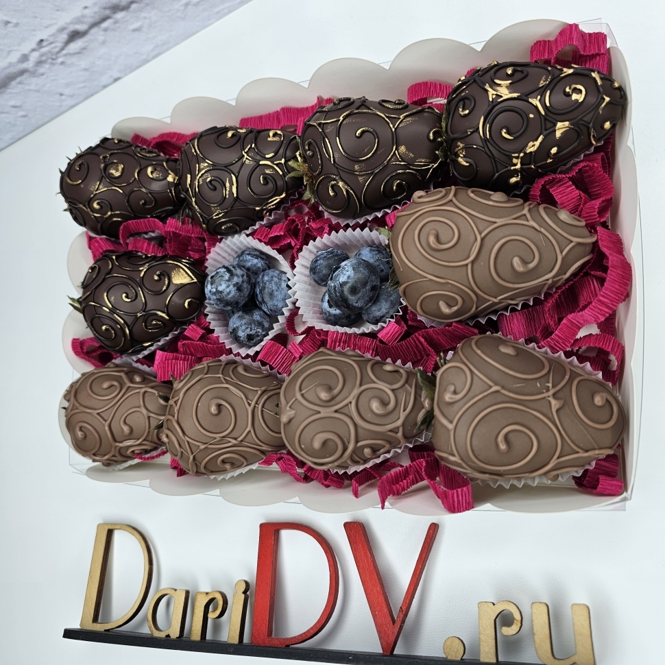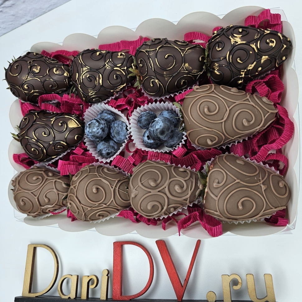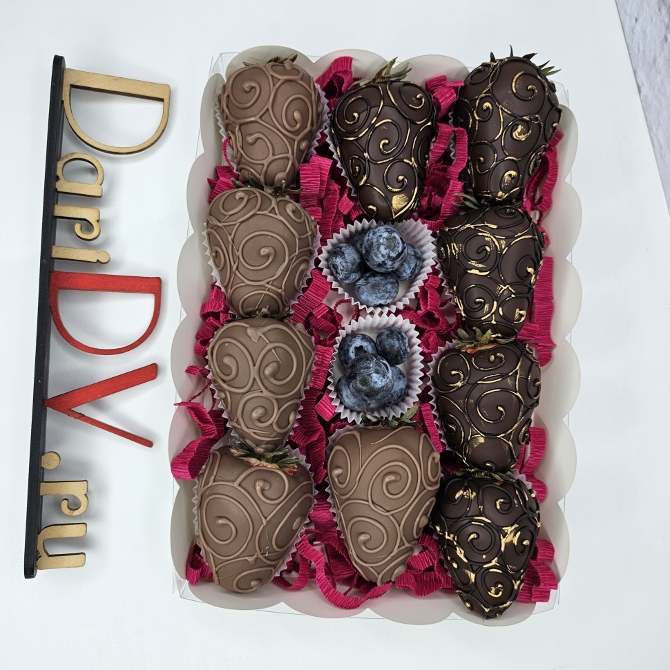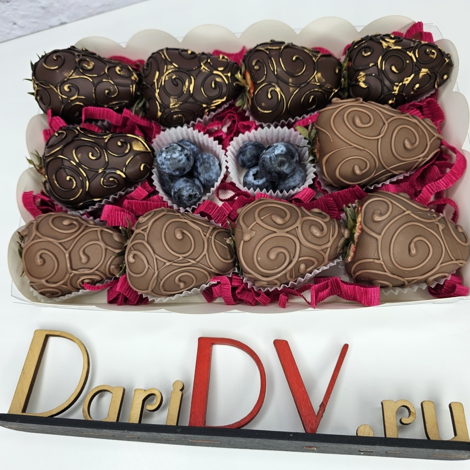 Качество и уникальностьБренд DariDV использует только качественные ингредиенты. Используется свежая клубника и настоящий бельгийский шоколад. Каждая ягода покрыта узорами ручной работы, что делает каждую из них уникальной. Набор упакован в элегантный бокс, который также может служить упаковкой для подарка. Бокс украшен бантом из атласной ленты, добавляющим изысканности.