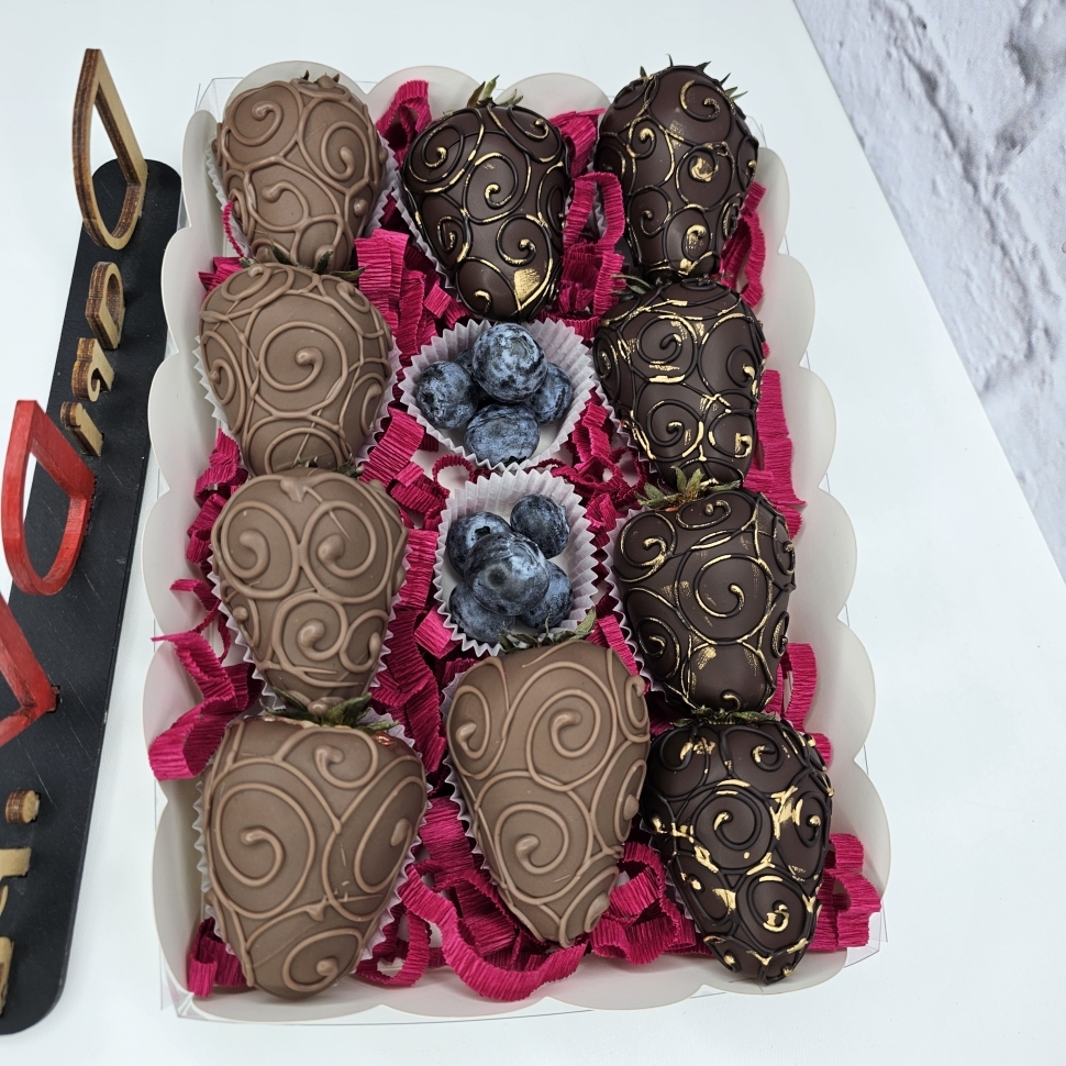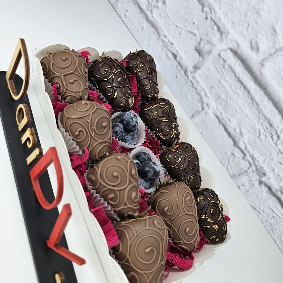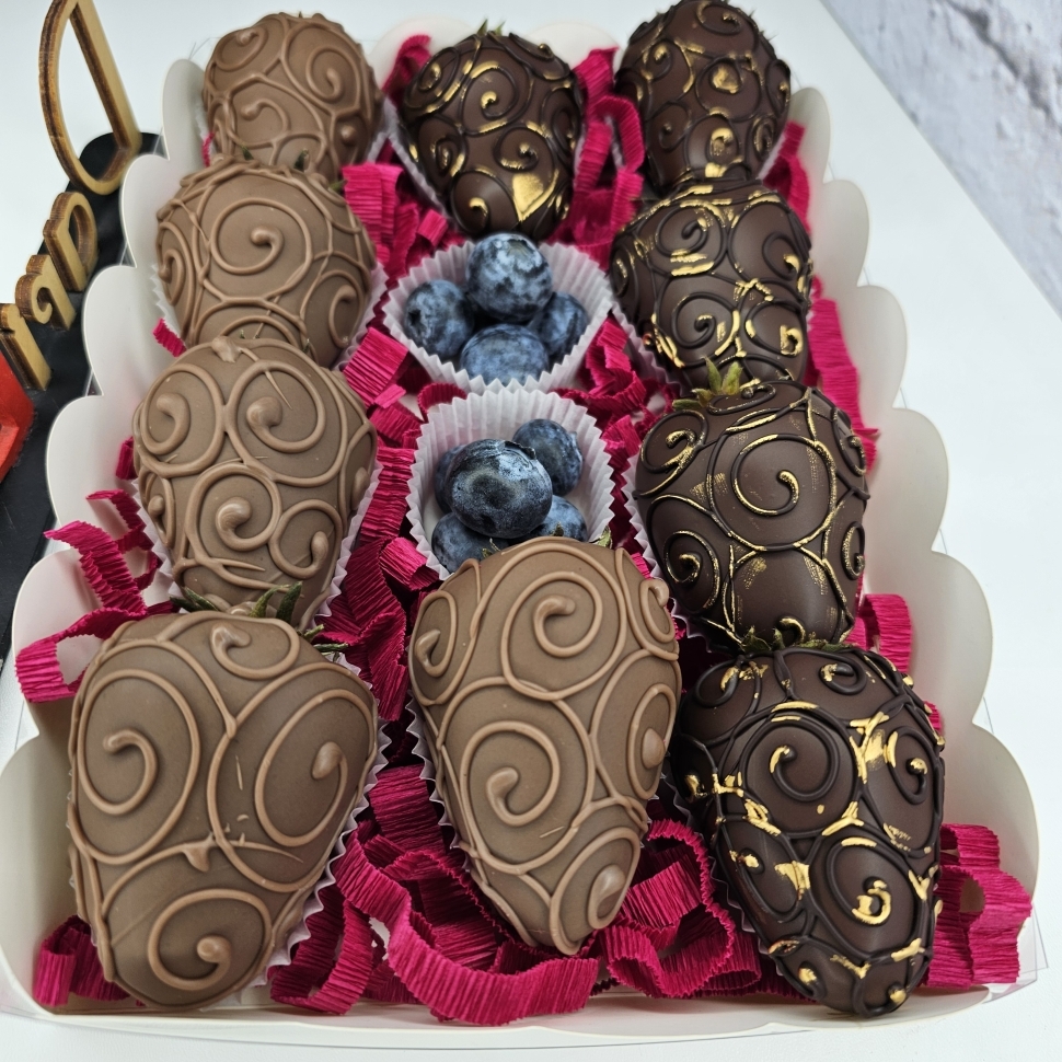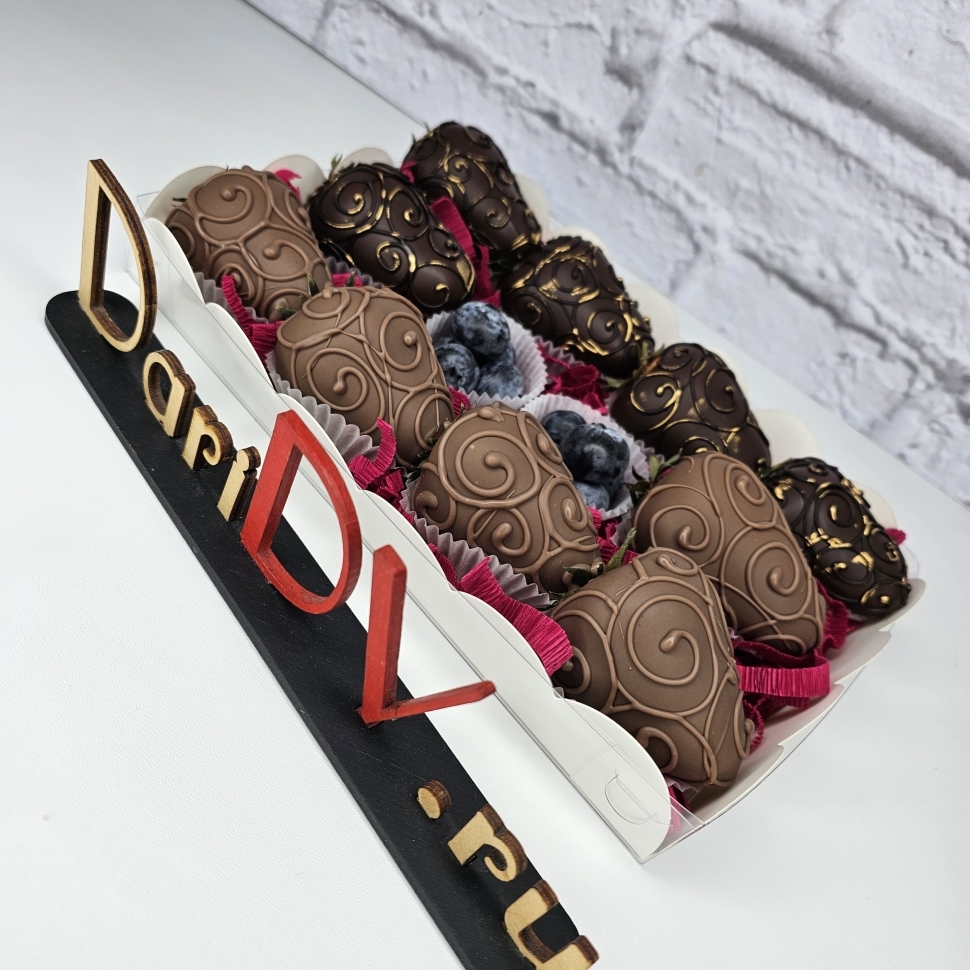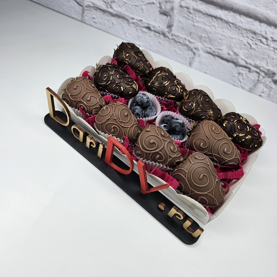 Качество и уникальностьБренд DariDV использует только качественные ингредиенты. Используется свежая клубника и настоящий бельгийский шоколад. Каждая ягода покрыта узорами ручной работы, что делает каждую из них уникальной. Набор упакован в элегантный бокс, который также может служить упаковкой для подарка. Бокс украшен бантом из атласной ленты, добавляющим изысканности.