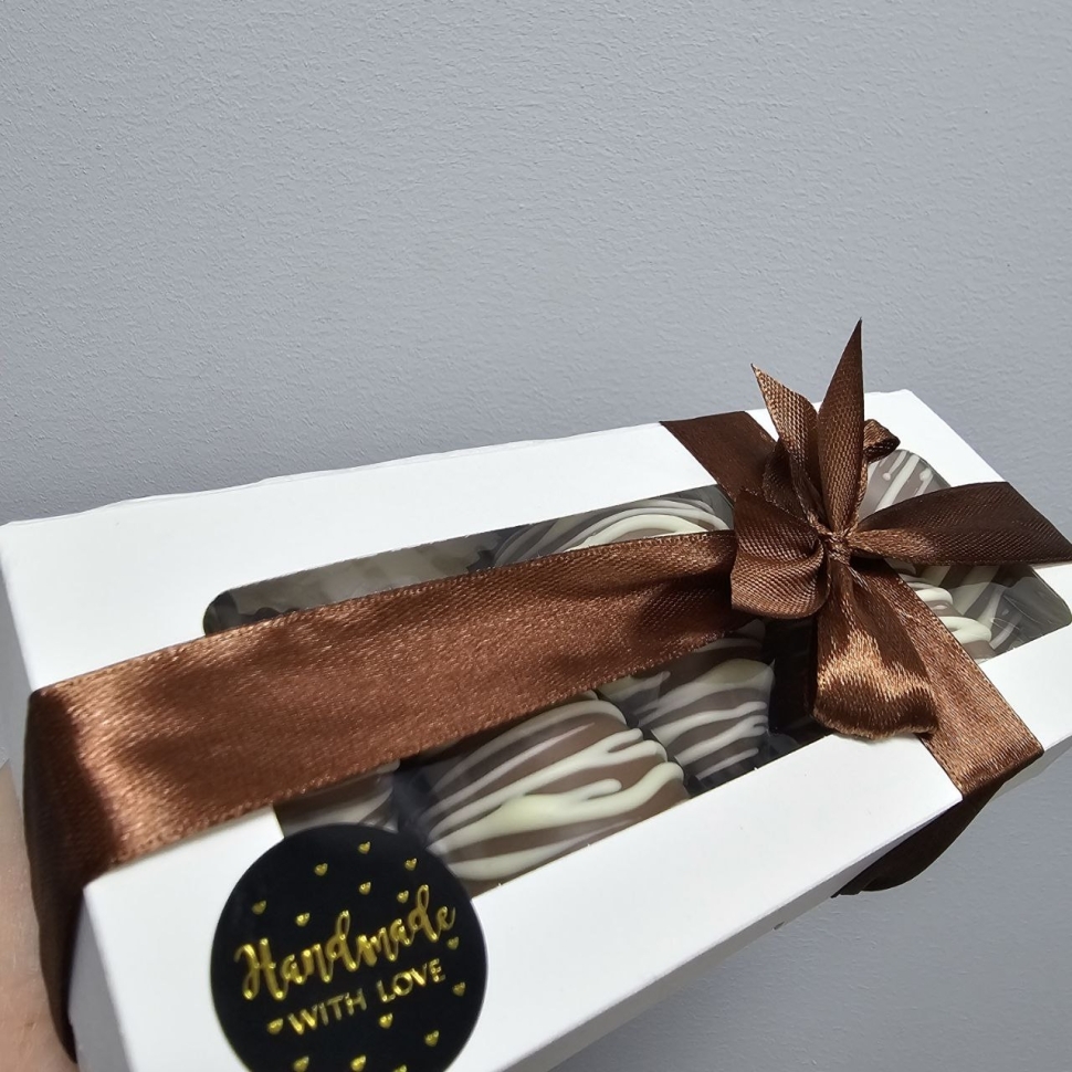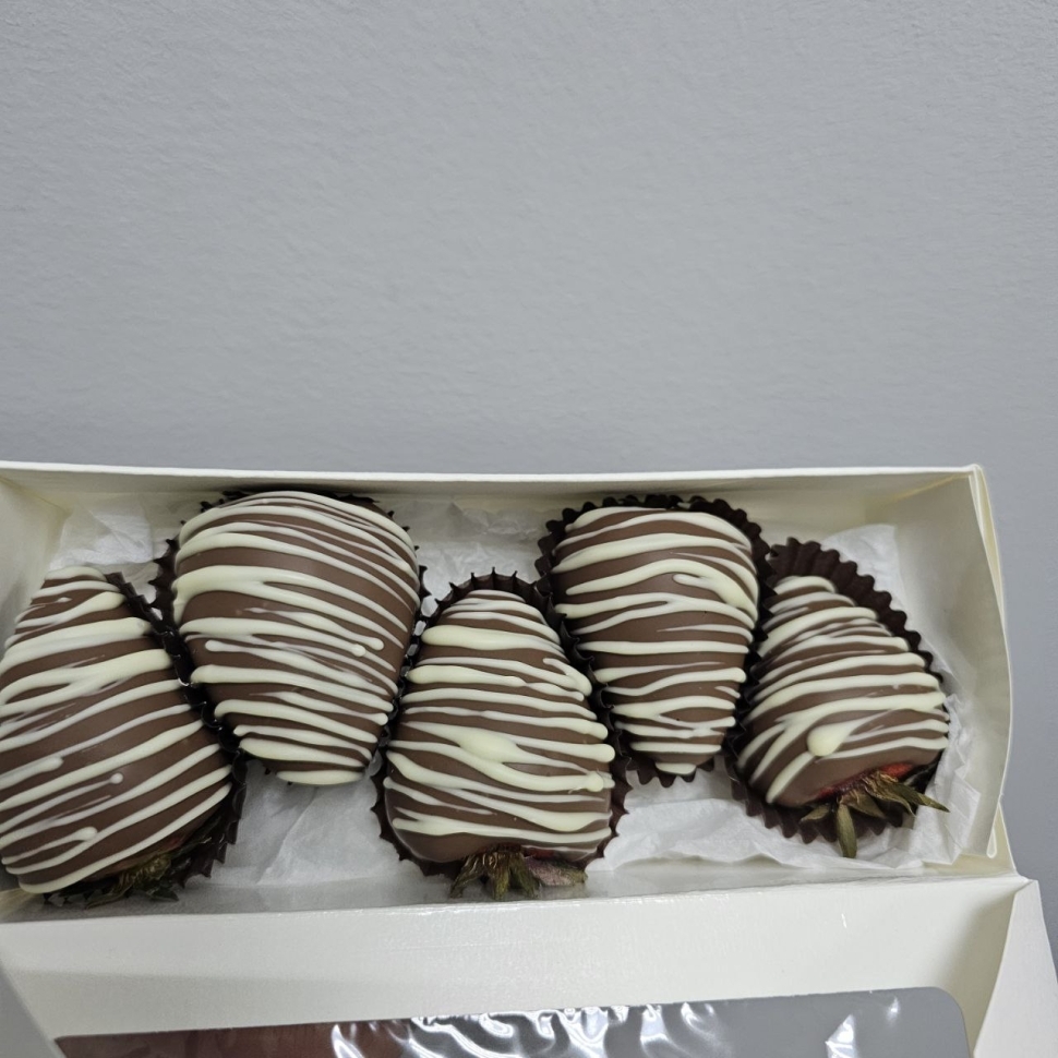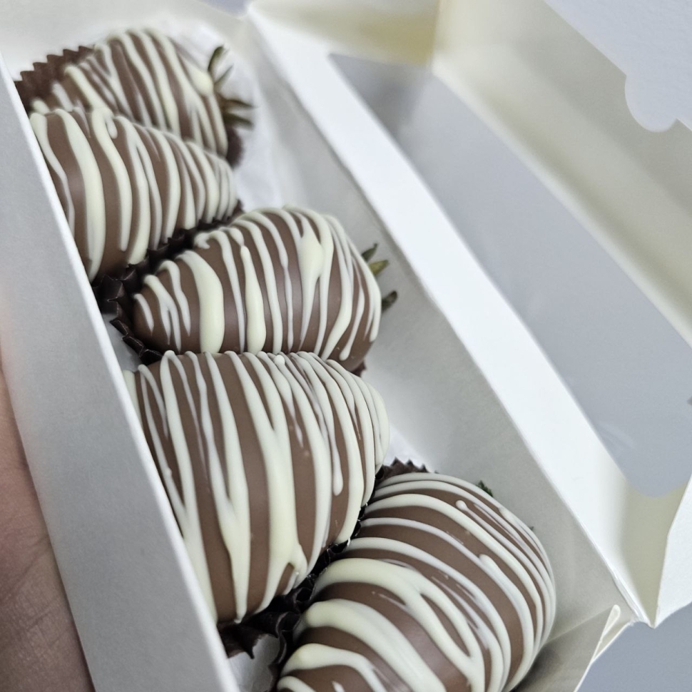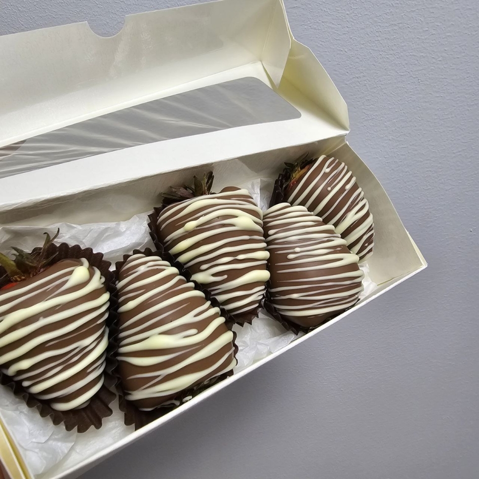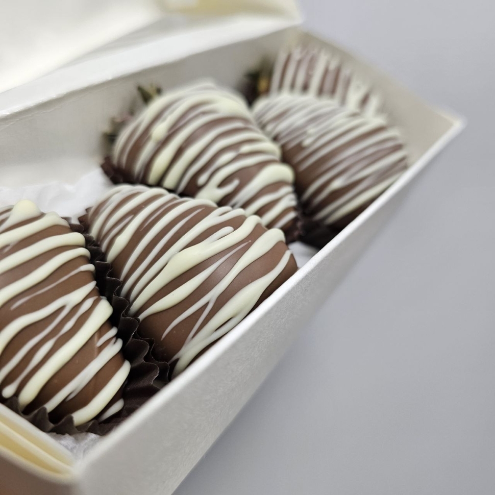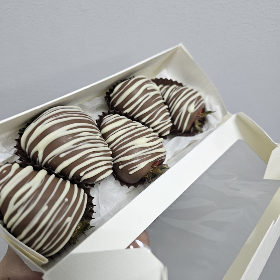 Состав набора5 свежих клубник, покрытых бельгийским молочным шоколадом;Упаковка из белого шоколада;
