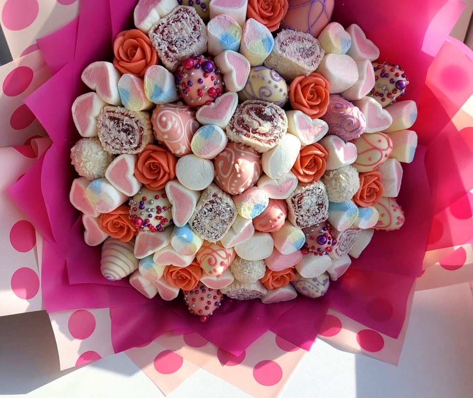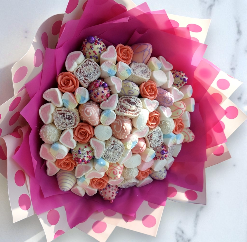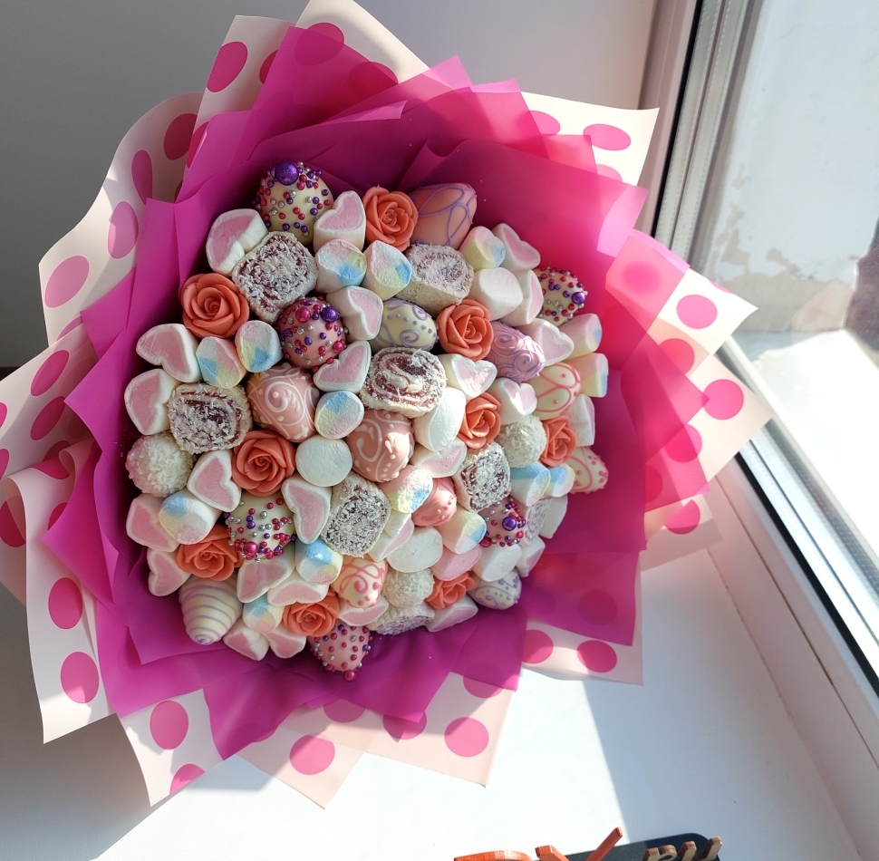 Детали и упаковкаВ букет также входят маршмеллоу микс, вкусный рахат-лукум, кокосовая стружка и сладкая кондитерская посыпка. Все эти детали создают неповторимый вкус и аромат букета. Узоры ручной работы делают каждый букет уникальным. Букет аккуратно упакован в дизайнерскую упаковку и декорирован бантом из атласной ленты.